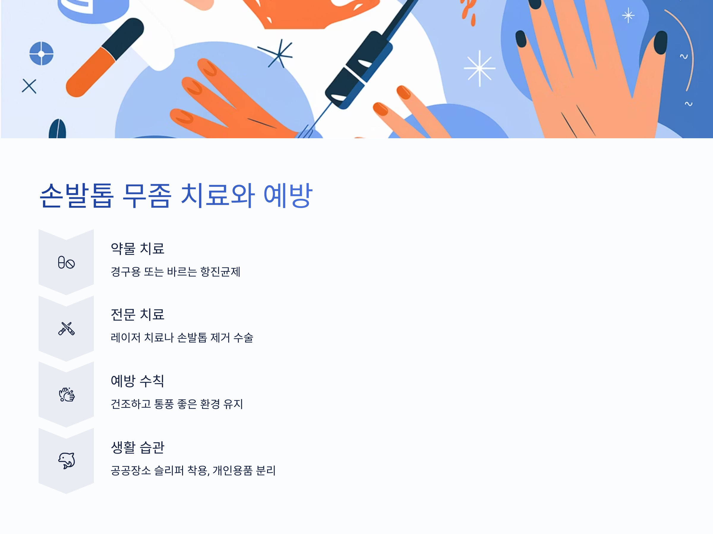 또한 가족 간 전염도 발생할 수 있어, 수건이나 손톱깎이 등 개인용품은 반드시 분리해 사용해야 합니다. 치료 중에는 손발톱 매니큐어나 젤네일 사용을 피하는 것이 좋습니다.