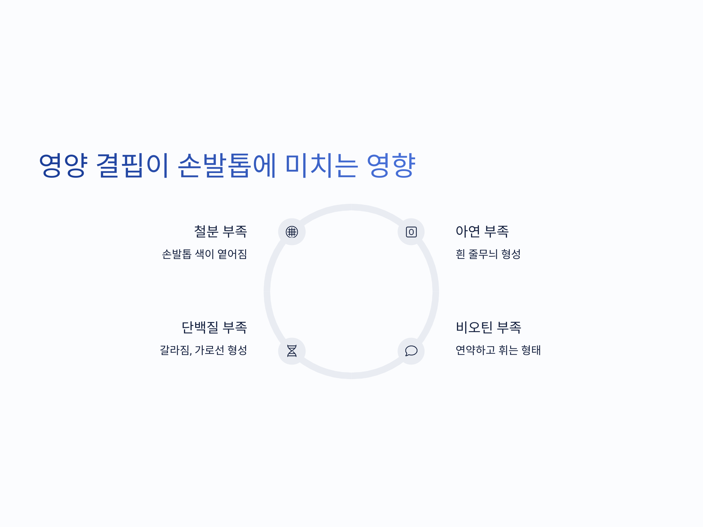 대표적인 증상으로는 손발톱의 흰 줄무늬, 연약하고 휘는 모양, 갈라짐, 가로선(보우선) 형성 등이 있습니다. 색이 옅어지고 윤기가 사라지며, 피부와 함께 손톱 주위도 건조해지는 경우가 많습니다. 무좀과 다르게 염증이나 들뜸은 나타나지 않는 경우가 일반적입니다.
