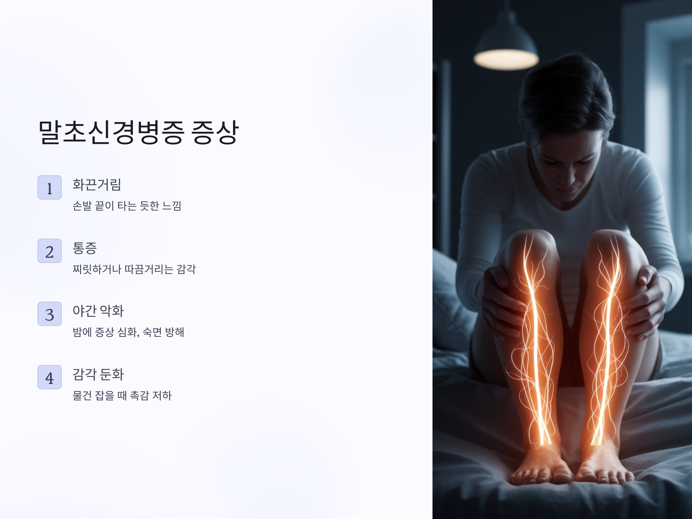 말초신경병증은 신경이 손상되거나 염증이 생겨 발생하는 질환으로, 특히 당뇨병 환자들에게 많이 나타납니다. 이 병의 주요 증상은 다음과 같습니다.