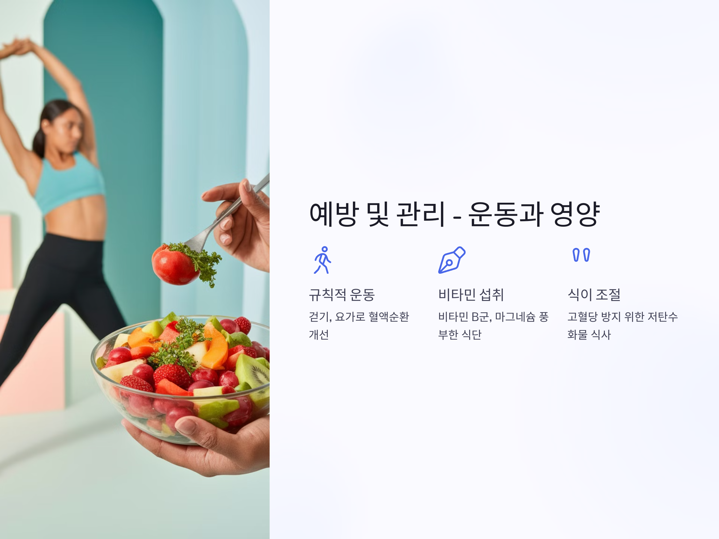 - 혈액순환을 개선하고 신경 건강을 지키기 위해 유산소 운동을 꾸준히 합니다.