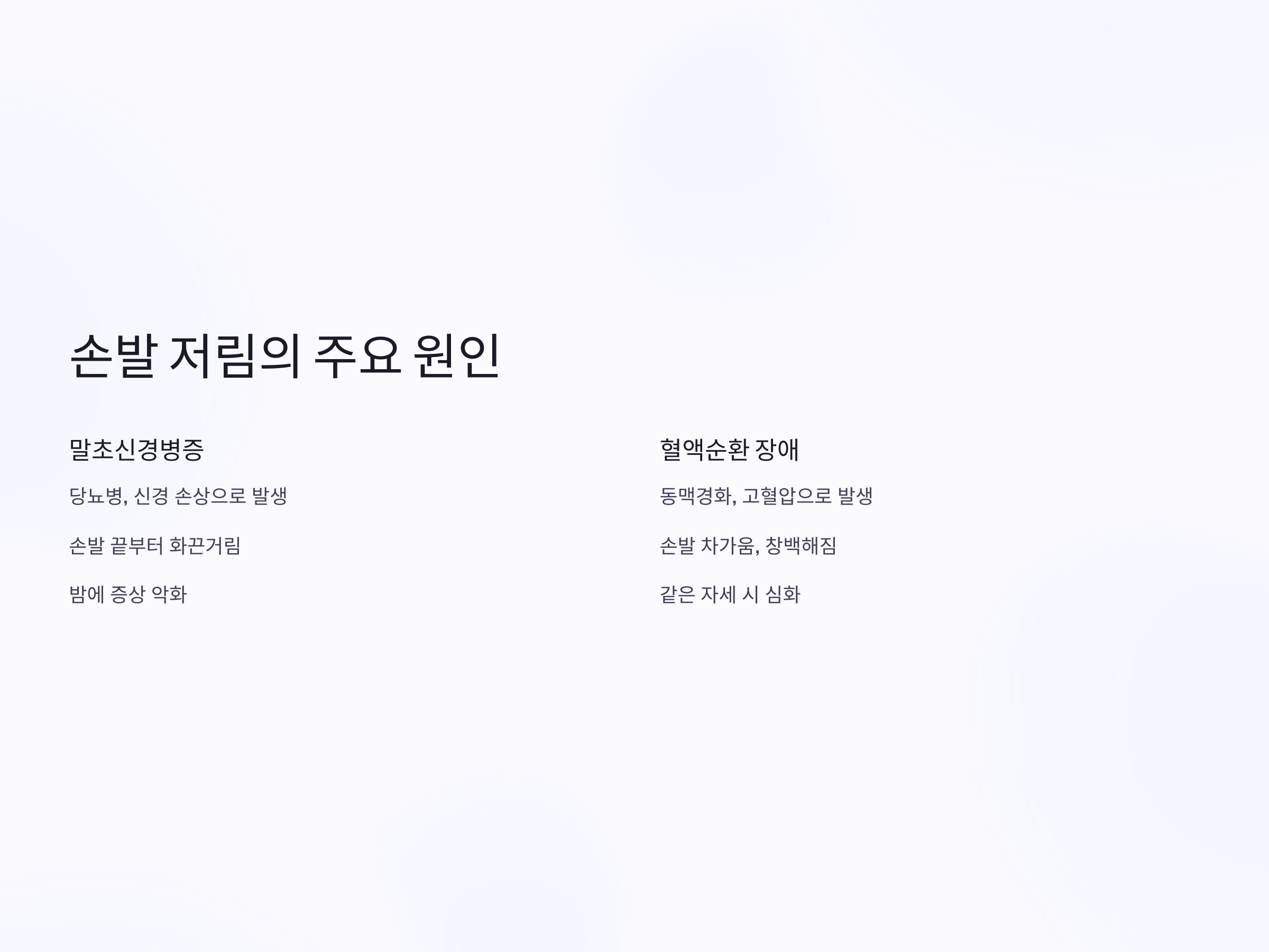 | 증상 | 말초신경병증 | 혈액순환 장애 |