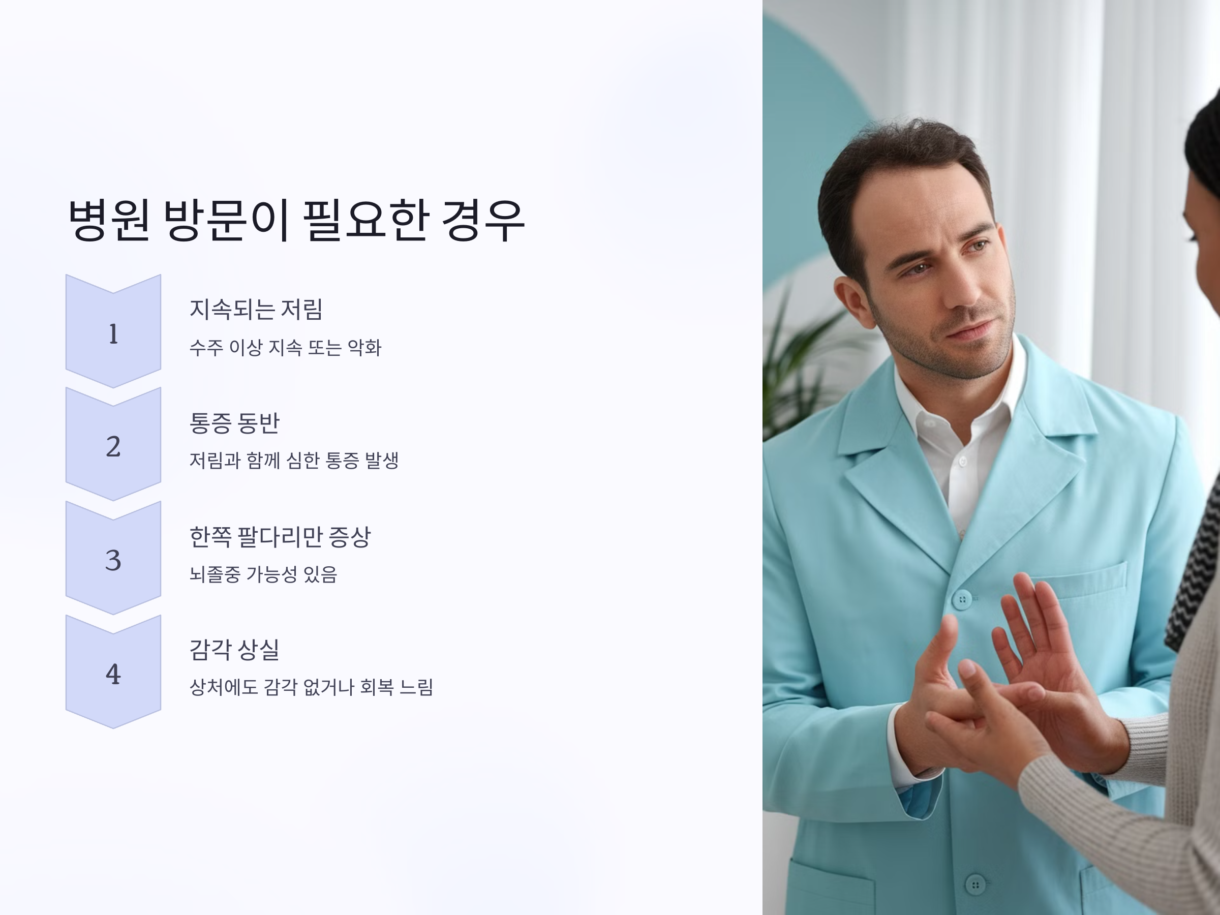 손발 저림이 일시적인 경우라면 크게 걱정할 필요 없지만, 다음과 같은 경우에는 반드시 병원에서 검사를 받아야 합니다.