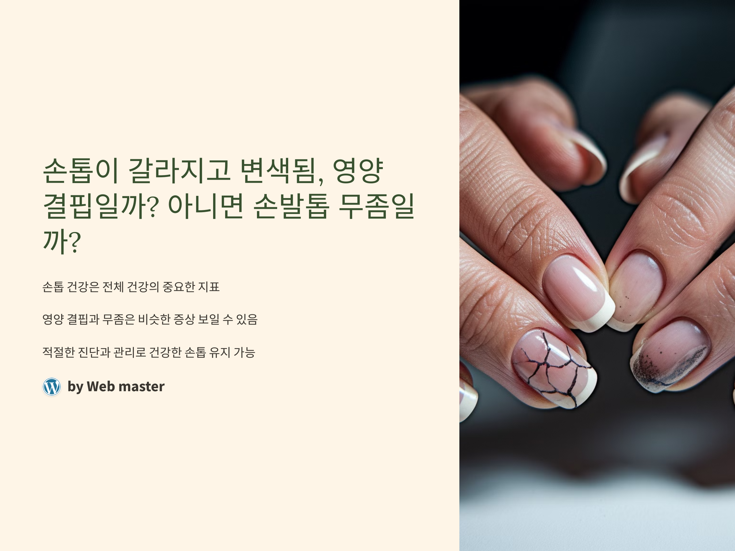 이 글에서는 손톱이 갈라지고 변색되는 문제의 원인으로 영양 결핍과 손발톱 무좀을 비교하고, 어떻게 구별할 수 있는지, 그리고 각 원인에 맞는 해결책을 제시합니다. 손톱 건강에 관심이 있다면 꼭 알아두어야 할 내용이므로, 끝까지 읽어보세요.