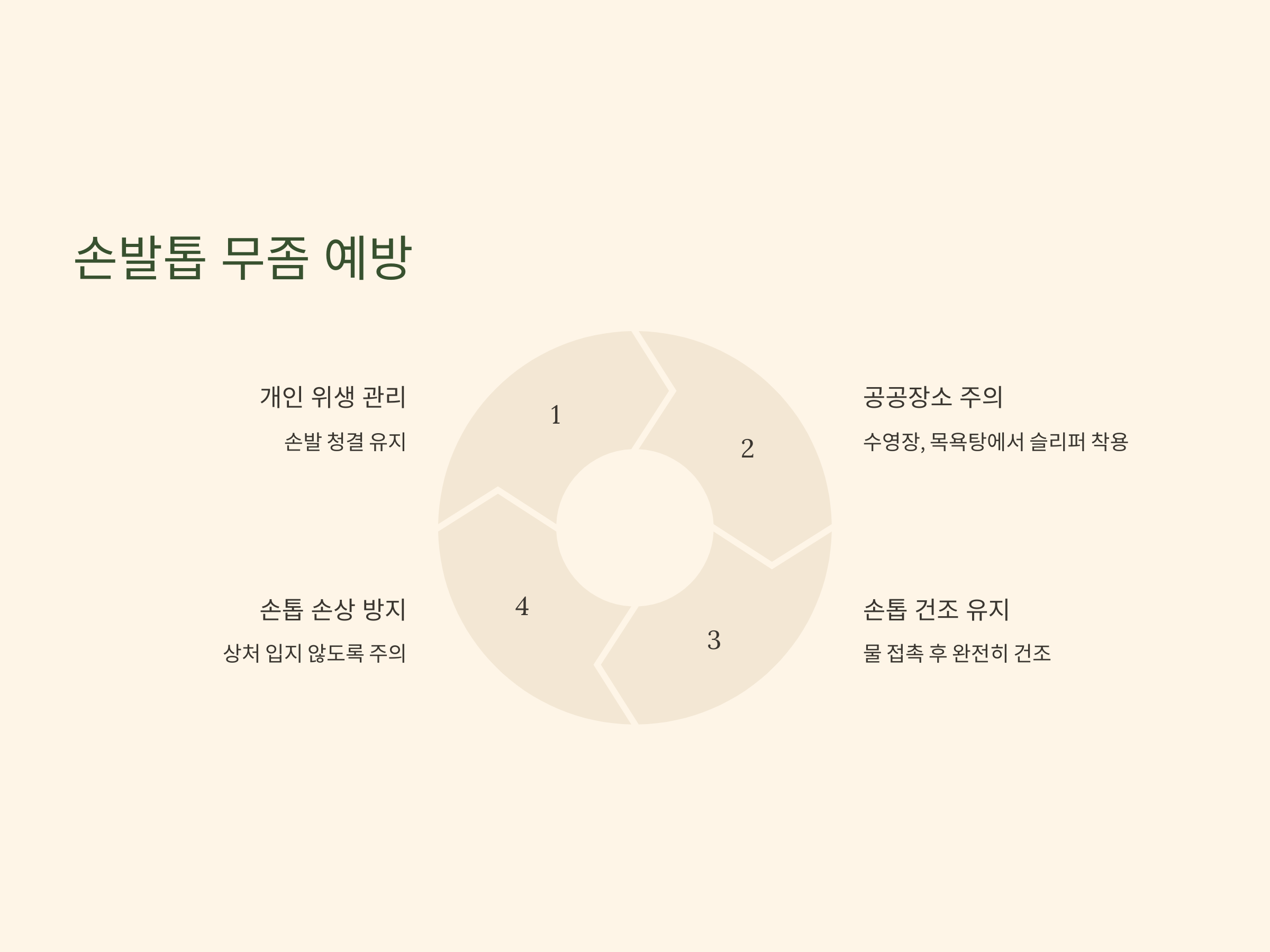 손발톱 무좀을 예방하려면 공공장소에서의 위생을 철저히 지키는 것이 중요합니다. 수영장이나 목욕탕에서는 샌들이나 슬리퍼를 착용하고, 손톱에 상처를 입지 않도록 주의해야 합니다.