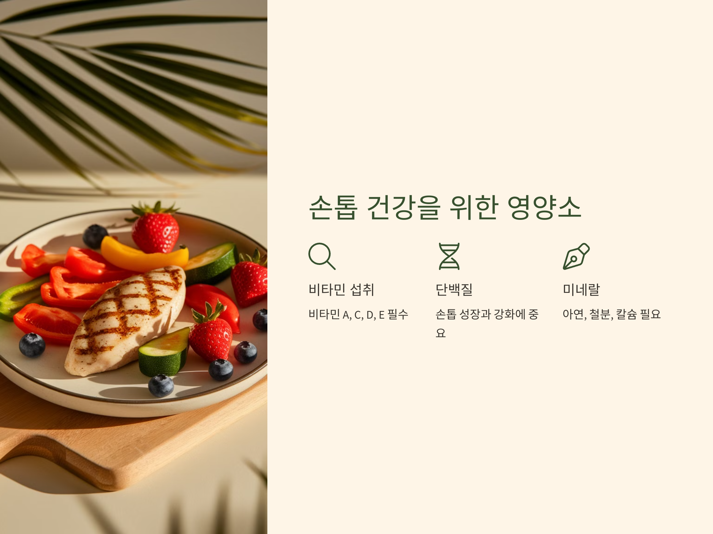 비타민 A, C, D, E, 아연, 철분 등을 충분히 섭취하여 손톱을 건강하게 유지해야 합니다. 특히 비타민 B군과 단백질이 풍부한 음식을 섭취하면 손톱이 빠르게 성장하고 건강해집니다.