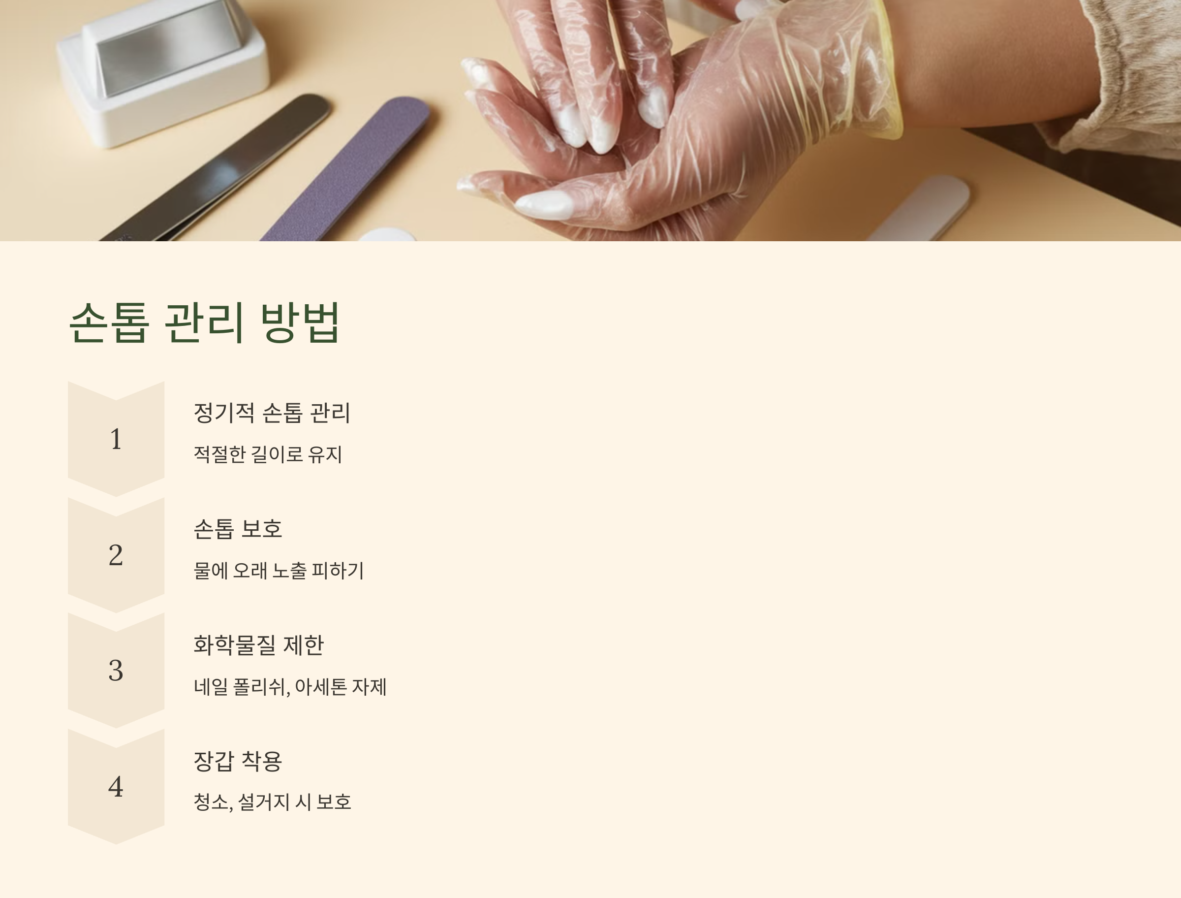 손톱을 자주 자르고 깨끗하게 관리하는 것이 중요합니다. 또한 손톱이 물에 오래 젖어 있지 않도록 주의하고, 손톱이 부러지지 않도록 보호하는 것도 필요합니다. 손톱을 너무 짧게 자르지 않도록 하고, 네일 폴리쉬나 아세톤을 자주 사용하지 않도록 합니다.