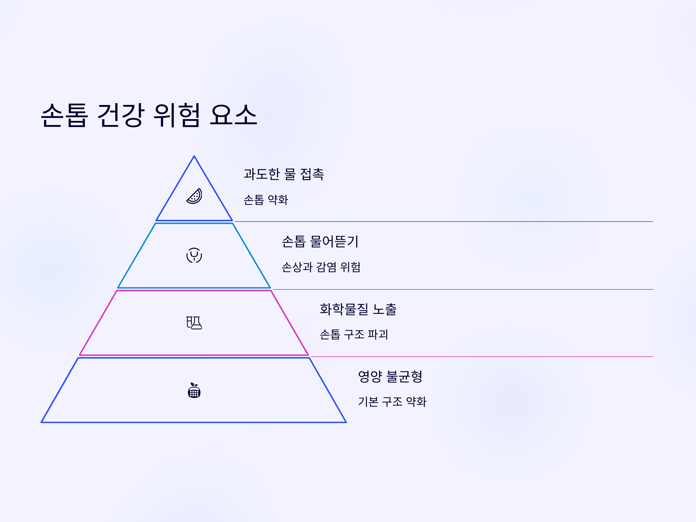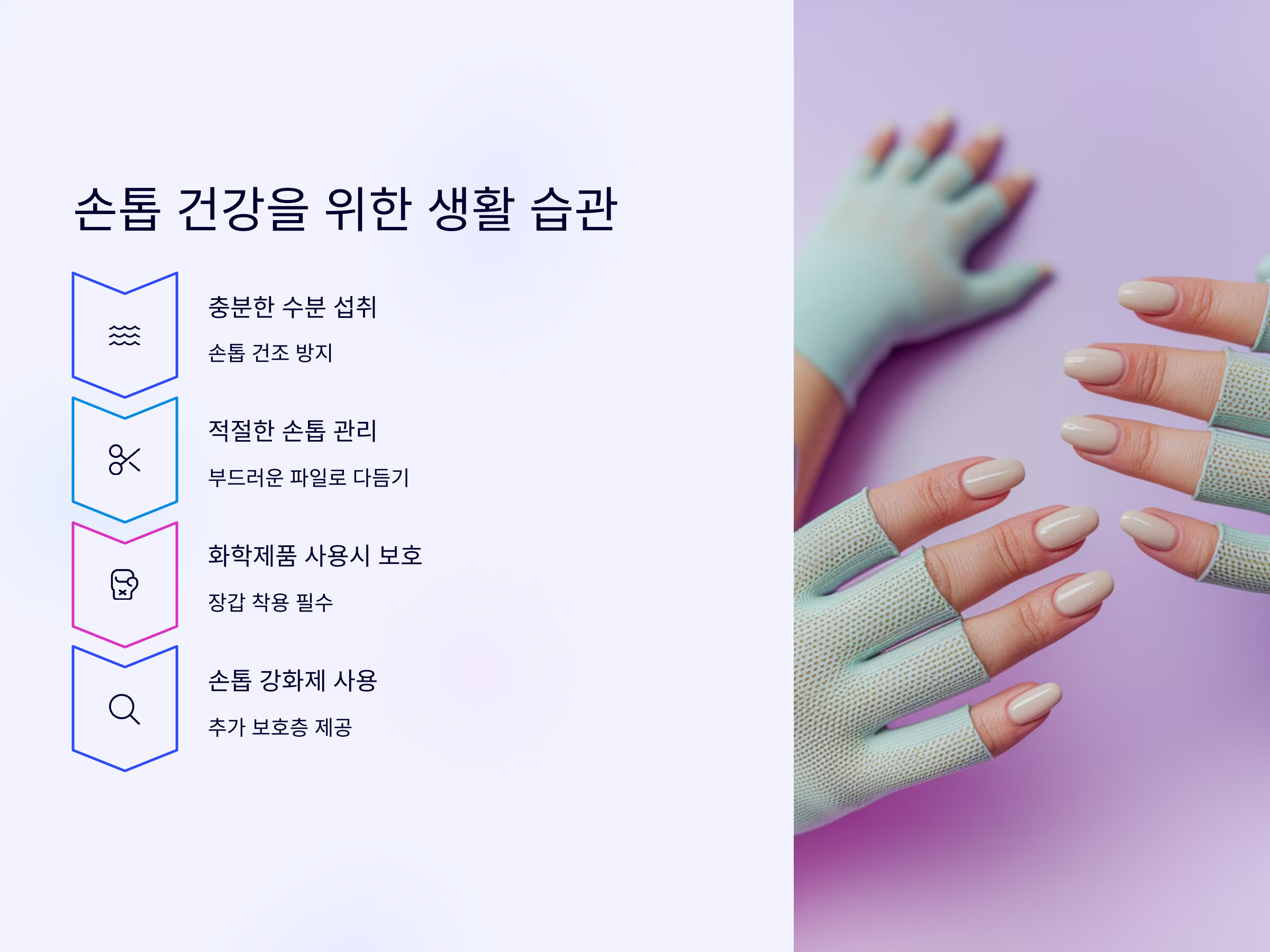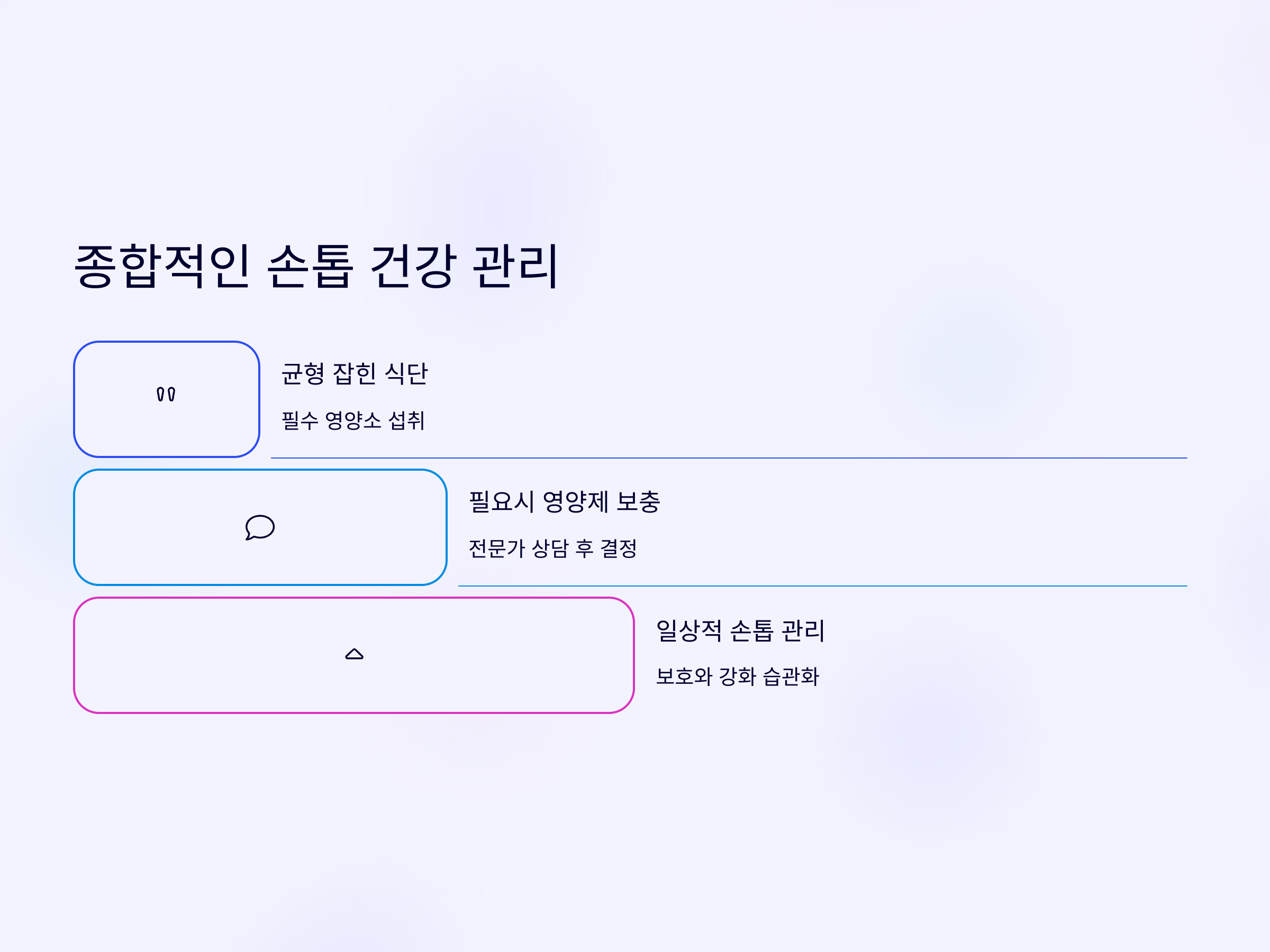 손톱 건강은 단기적인 관리가 아닌 꾸준한 관리와 예방이 중요합니다. 철분 결핍이나 영양 부족으로 인한 문제를 예방하고, 건강한 손톱을 유지하기 위한 방법들을 실천해 보세요.