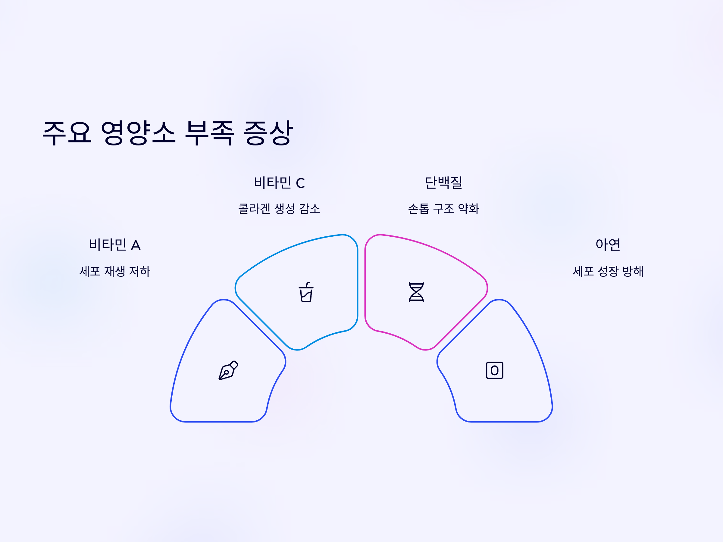 영양 부족은 손톱 건강에 영향을 미치는 또 다른 중요한 원인입니다. 손톱은 우리의 전반적인 건강 상태를 반영하기 때문에, 특정 영양소가 부족하면 손톱이 약해지거나 갈라질 수 있습니다. 특히 비타민 A, C, E, 아연, 단백질 등의 영양소는 손톱을 강하게 하고 건강하게 유지하는 데 중요한 역할을 합니다. 이러한 영양소들이 부족하면 손톱이 쉽게 부러지거나 갈라지며, 손톱의 성장에도 부정적인 영향을 미칠 수 있습니다.