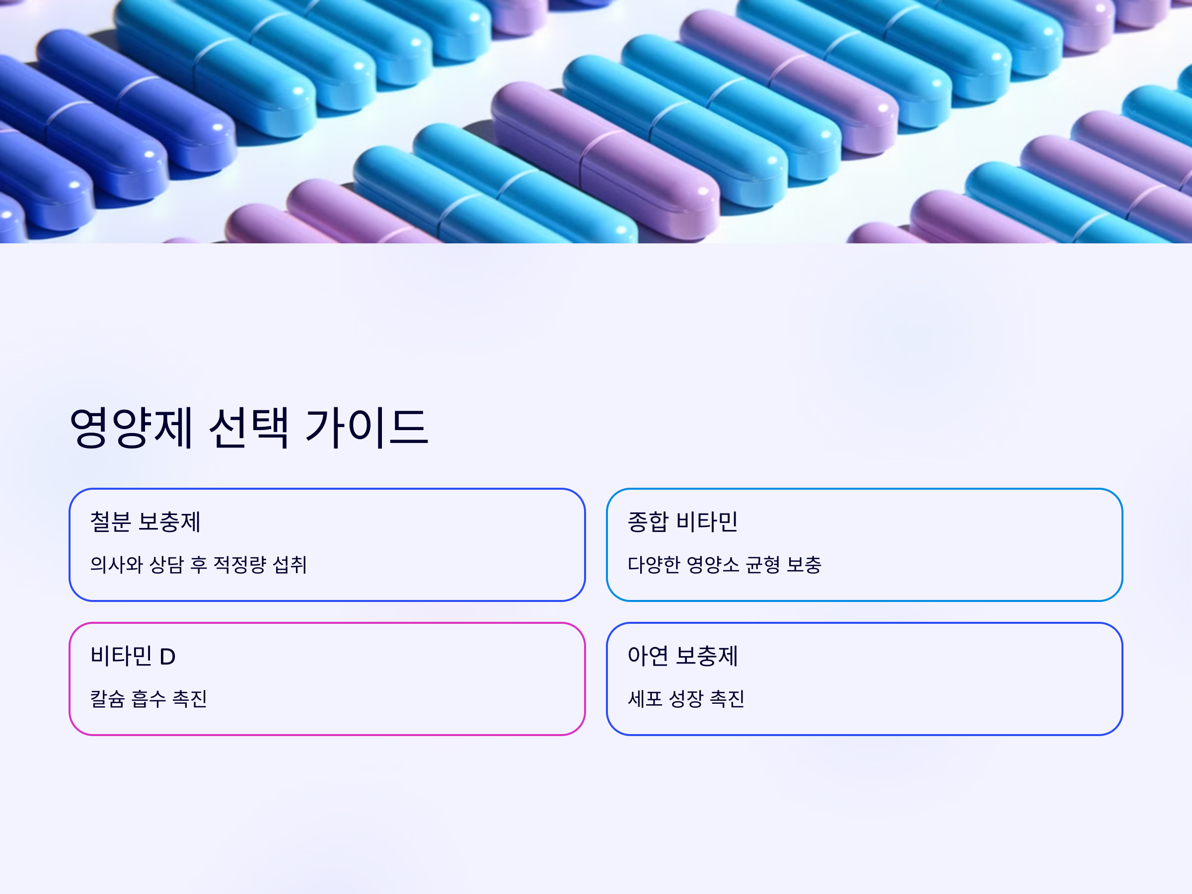 철분 결핍이 심각한 경우에는 철분 보충제를 고려할 수 있습니다. 철분 보충제는 혈중 철분 농도를 정상 범위로 회복하는 데 도움이 됩니다. 하지만, 철분 보충제를 과다하게 섭취하는 것은 좋지 않기 때문에, 의사와 상담 후 적정량을 섭취하는 것이 중요합니다. 또한, 다른 비타민과 미네랄도 함께 보충할 수 있는 종합 비타민제를 선택하는 것이 좋습니다.
