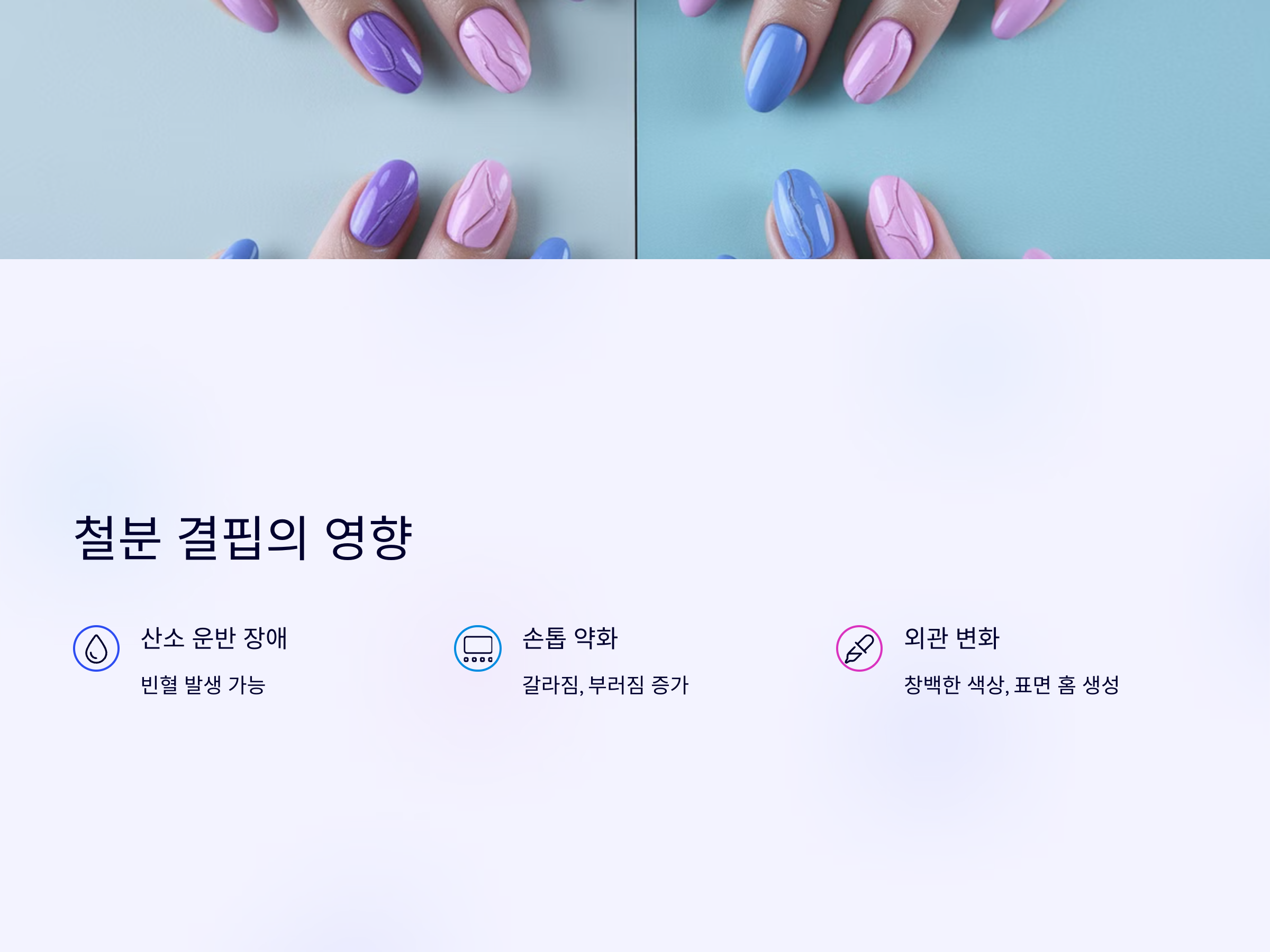 철분은 우리 몸에서 산소를 운반하는 중요한 역할을 하는 미네랄입니다. 철분이 부족하면 빈혈이 발생할 수 있으며, 이는 손톱을 포함한 여러 신체 부위에 영향을 미칩니다. 특히 손톱에 나타나는 증상으로는 갈라짐, 부러짐, 약화 등이 있습니다. 철분 결핍으로 인한 빈혈은 산소 공급 부족을 초래하여 손톱의 건강을 더욱 악화시킬 수 있습니다. 또한, 철분 결핍은 손톱의 색깔을 창백하게 만들거나, 손톱의 표면에 홈이 생기게 만들 수 있습니다.