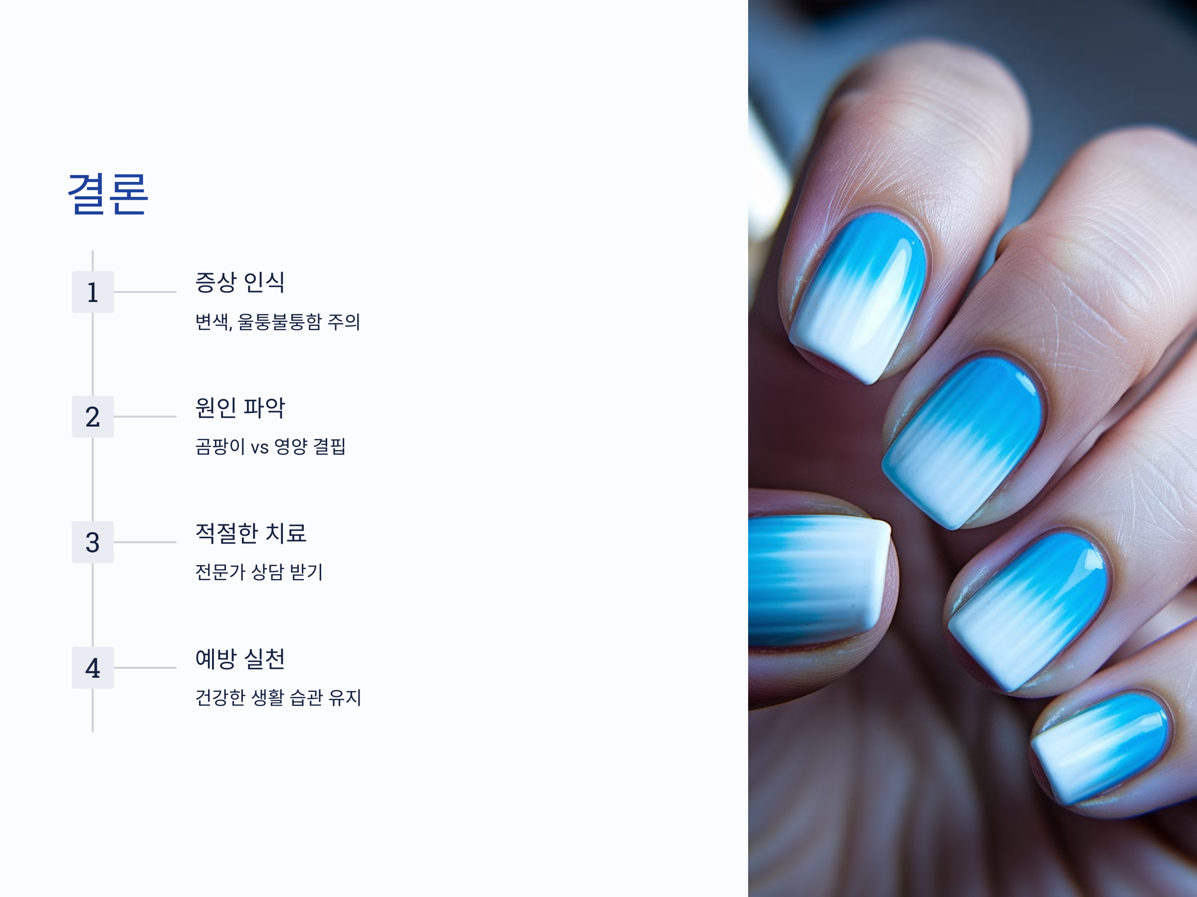 - 기타 증상: 손톱 외에도 피부나 머리카락에 건조함, 탈모 등이 동반될 수 있음.