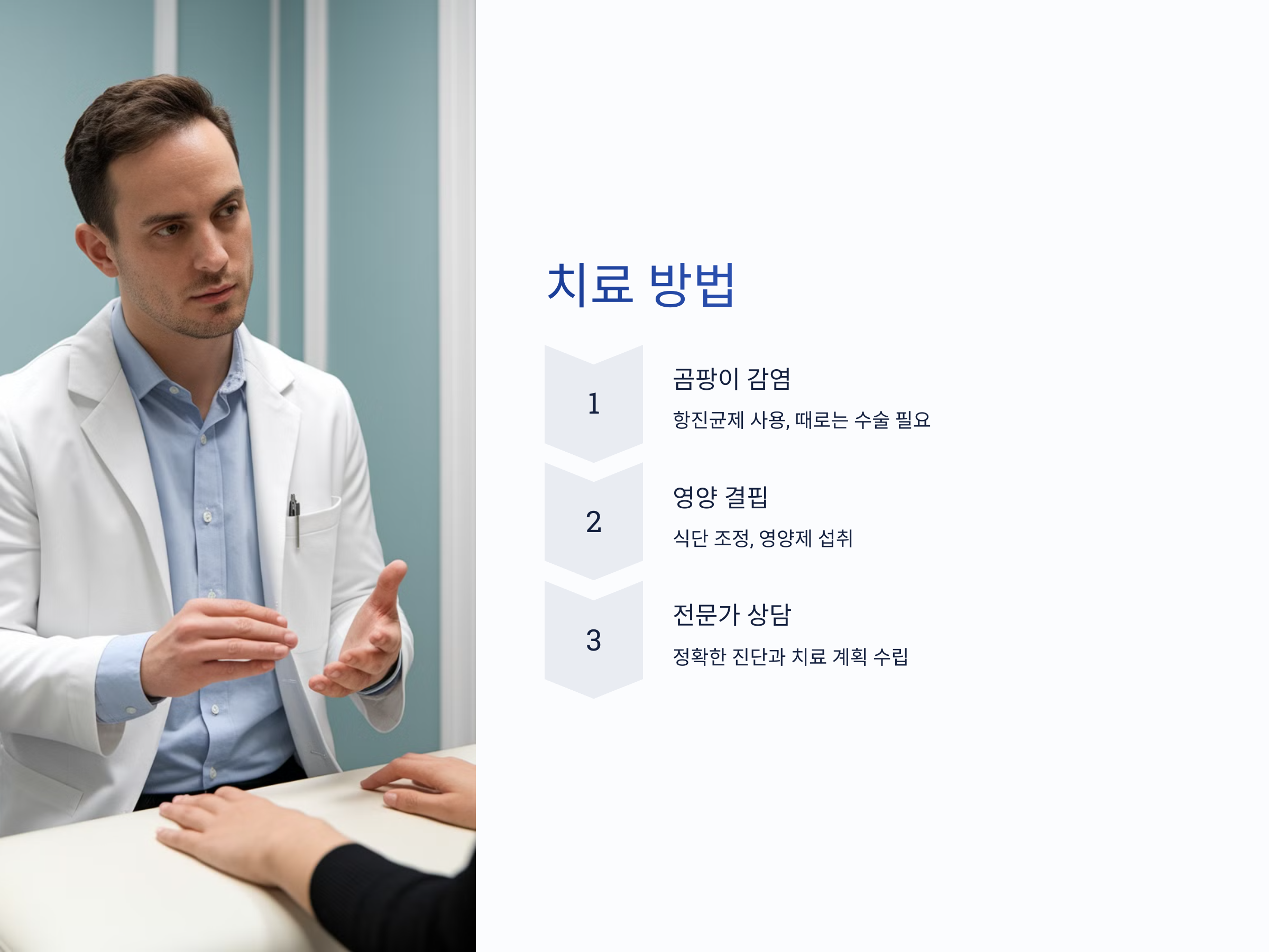 영양 결핍이 원인이라면, 먼저 부족한 영양소를 보충하는 것이 중요합니다. 균형 잡힌 식사를 하고, 부족한 영양소가 있다면 영양제를 섭취하는 것이 좋습니다.