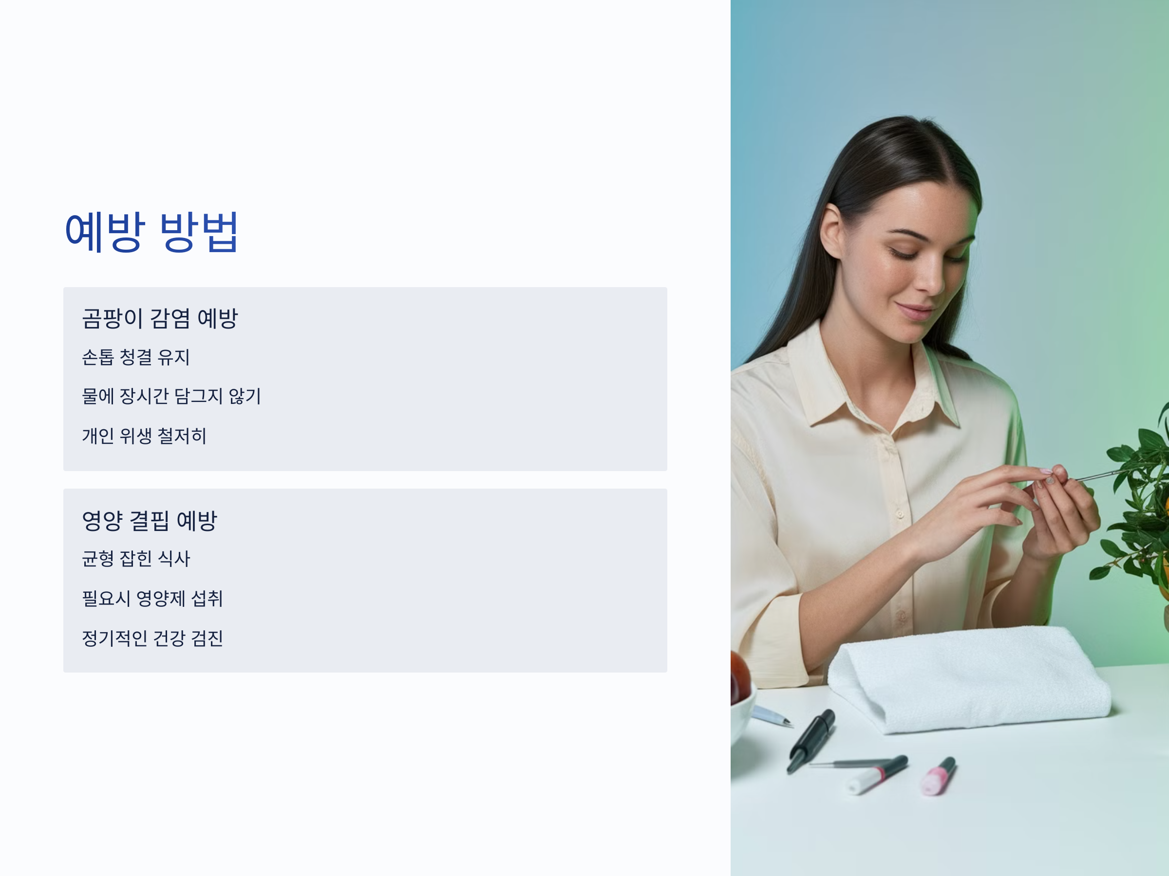 - 손톱을 청결하게 유지하고, 손톱 주위에 상처가 생기지 않도록 주의합니다.