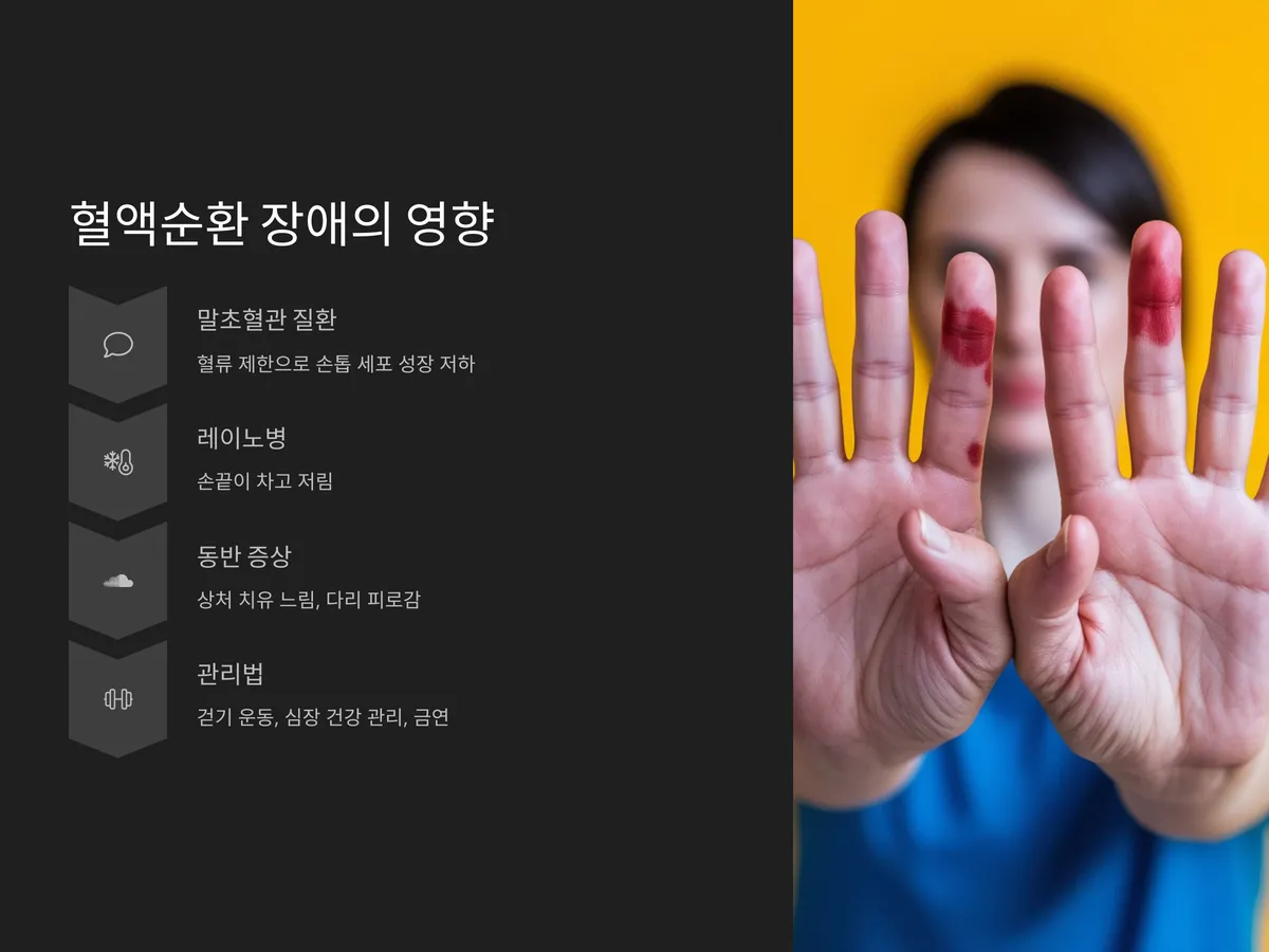 혈액순환 장애가 있는 경우, 특히 말초혈관 질환(Peripheral Artery Disease, PAD)이나 레이노병(Raynaud's disease)이 있는 경우 손톱에 변화가 일어날 수 있습니다. 이는 혈류가 제한되어 손톱 세포의 성장과 유지에 필요한 산소와 영양분이 부족해지기 때문입니다.
