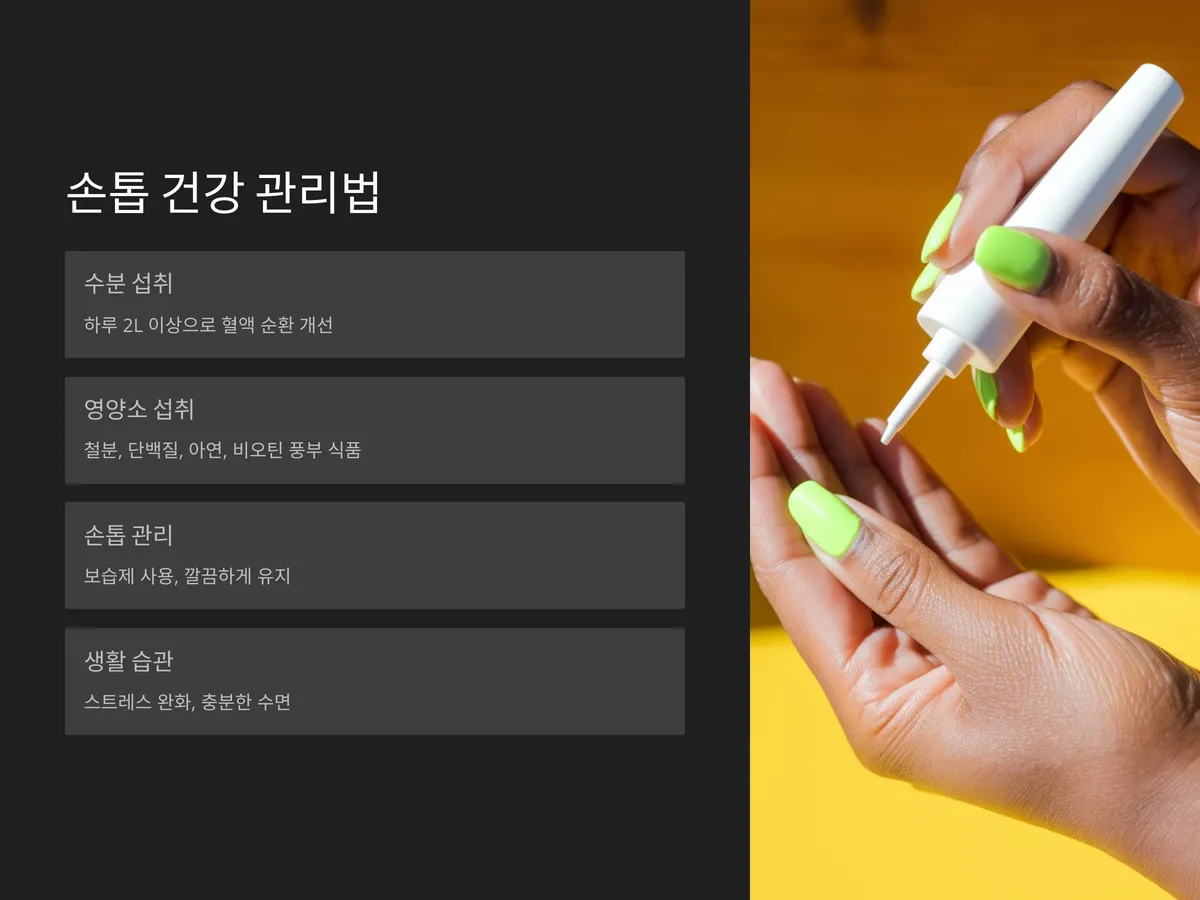 손톱 건강은 전신 건강과 직결되기 때문에, 일상 속 꾸준한 관리가 필수입니다. 다음은 손톱 세로줄을 예방하고 깨지는 손톱을 개선하는 데 효과적인 방법들입니다: