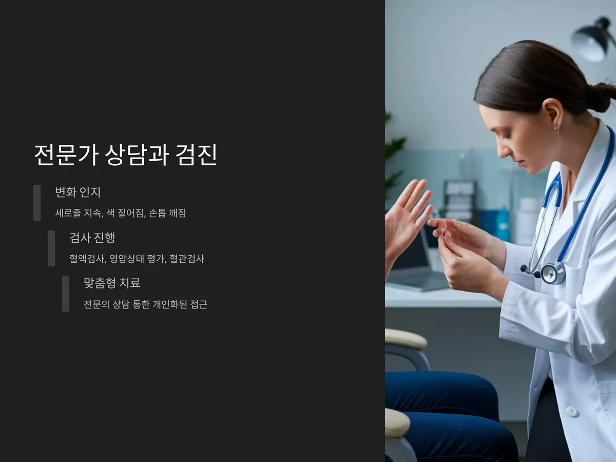 손톱에 변화가 생겼을 때, 이를 단순한 미용적 문제로 여기는 경우가 많지만, 이는 명백한 건강 경고 신호일 수 있습니다. 특히 세로줄이 지속되거나 색이 짙어지고, 손톱이 자주 깨지는 경우는 반드시 혈액검사, 영양상태 평가, 혈관검사를 고려해야 합니다.