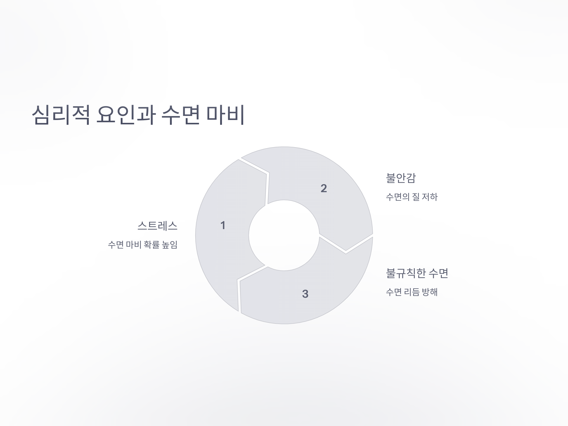 수면 마비는 심리적인 요인과도 밀접한 관계가 있습니다. 스트레스나 불안감, 우울증 등은 수면의 질을 낮추고, 수면 마비가 발생할 확률을 높일 수 있습니다. 심리적으로 과도하게 긴장된 상태로 잠자리에 들면, 뇌가 수면 주기 중 깨어날 때 신체가 빠르게 따라가지 못해 마비 증상이 나타날 수 있습니다. 또한, 과중한 업무나 정신적인 피로로 인해 제대로 된 휴식을 취하지 못하면 수면의 질이 떨어지고, 그로 인해 수면 마비의 빈도가 증가할 수 있습니다.