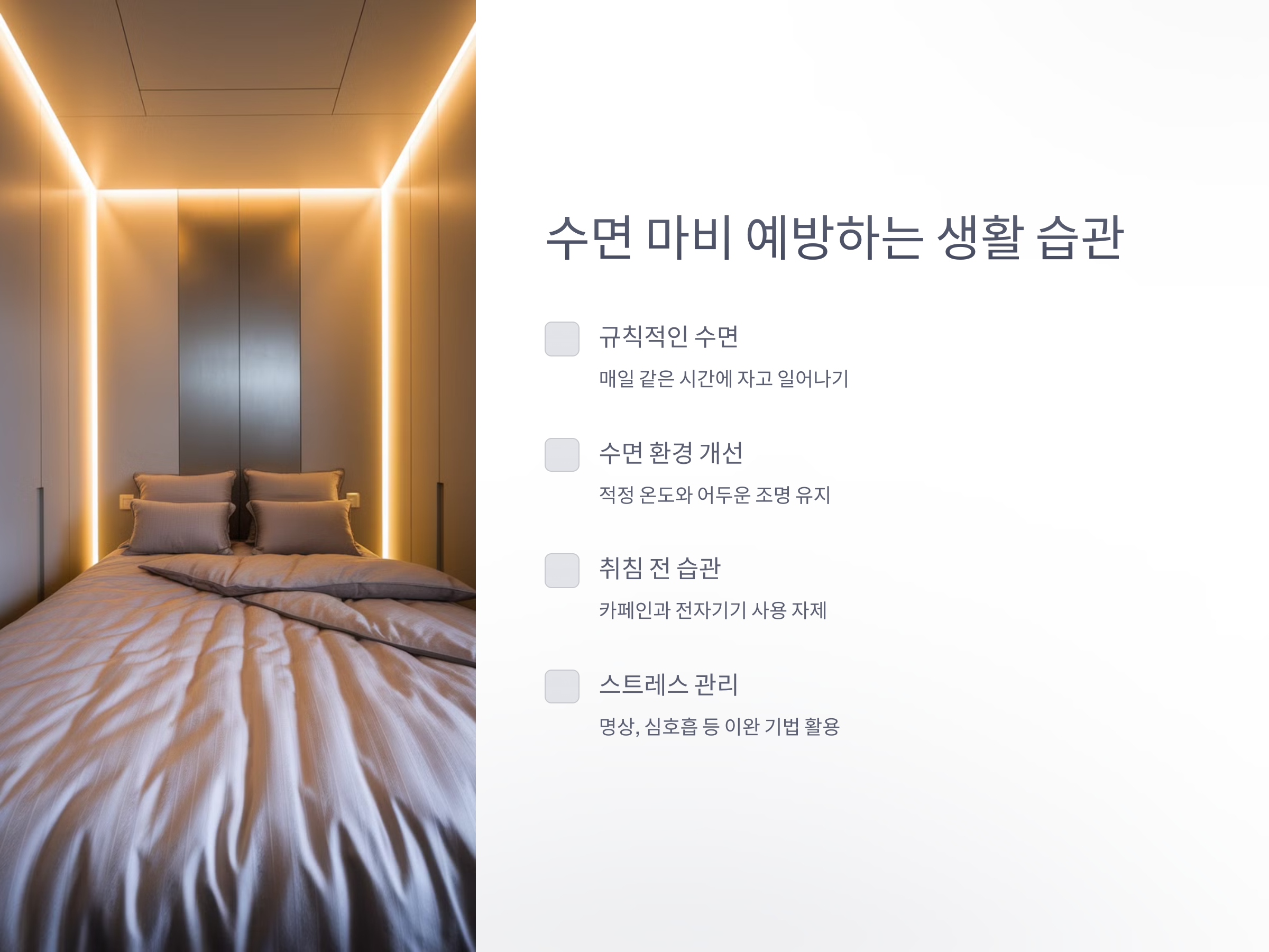 수면 마비를 예방하려면 먼저 건강한 수면 습관을 가지는 것이 중요합니다. 가장 기본적인 수면 습관은 규칙적인 시간에 잠자리에 들고, 규칙적으로 일어나는 것입니다. 또한, 잠자기 전에는 카페인이나 알콜을 피하고, 스마트폰이나 컴퓨터 사용을 자제하는 것이 좋습니다. 화면에서 나오는 블루라이트는 뇌를 자극해 수면을 방해할 수 있기 때문입니다.
