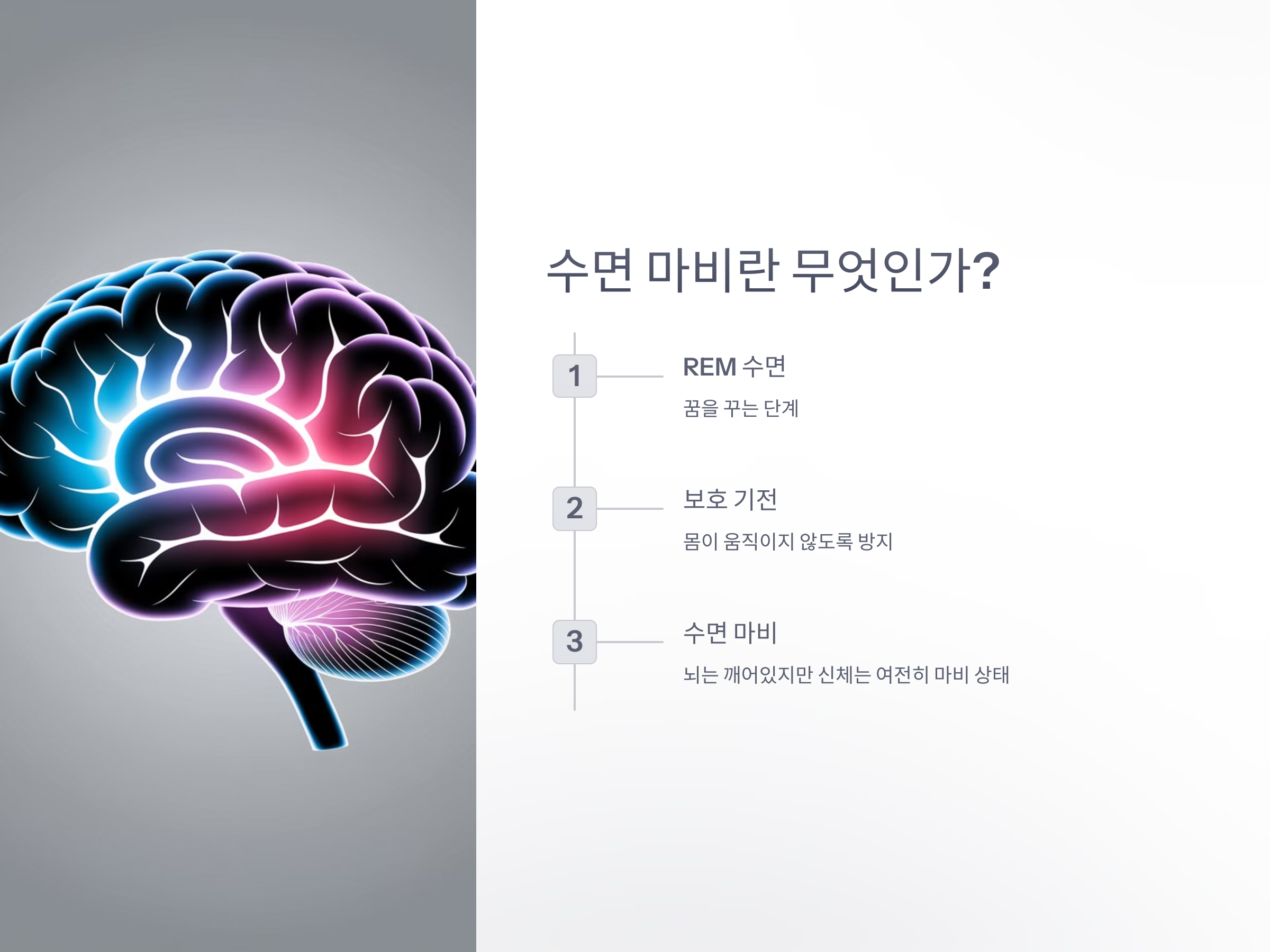 수면 마비는 사실 수면 주기의 일부로 자연스럽게 발생할 수 있습니다. 우리는 밤에 여러 번 REM(빠른 안구 운동) 수면과 비REM 수면을 반복하며 잠을 자게 되는데, 수면 마비는 주로 REM 수면에서 깨어날 때 발생합니다. REM 수면은 꿈을 꾸는 단계이며, 이때 우리의 뇌는 매우 활발하게 활동하지만 신체는 움직이지 않도록 되어 있습니다. 이는 우리가 꿈을 꾸면서 실제로 몸을 움직이지 않도록 방지하는 신경학적 보호 기전입니다.