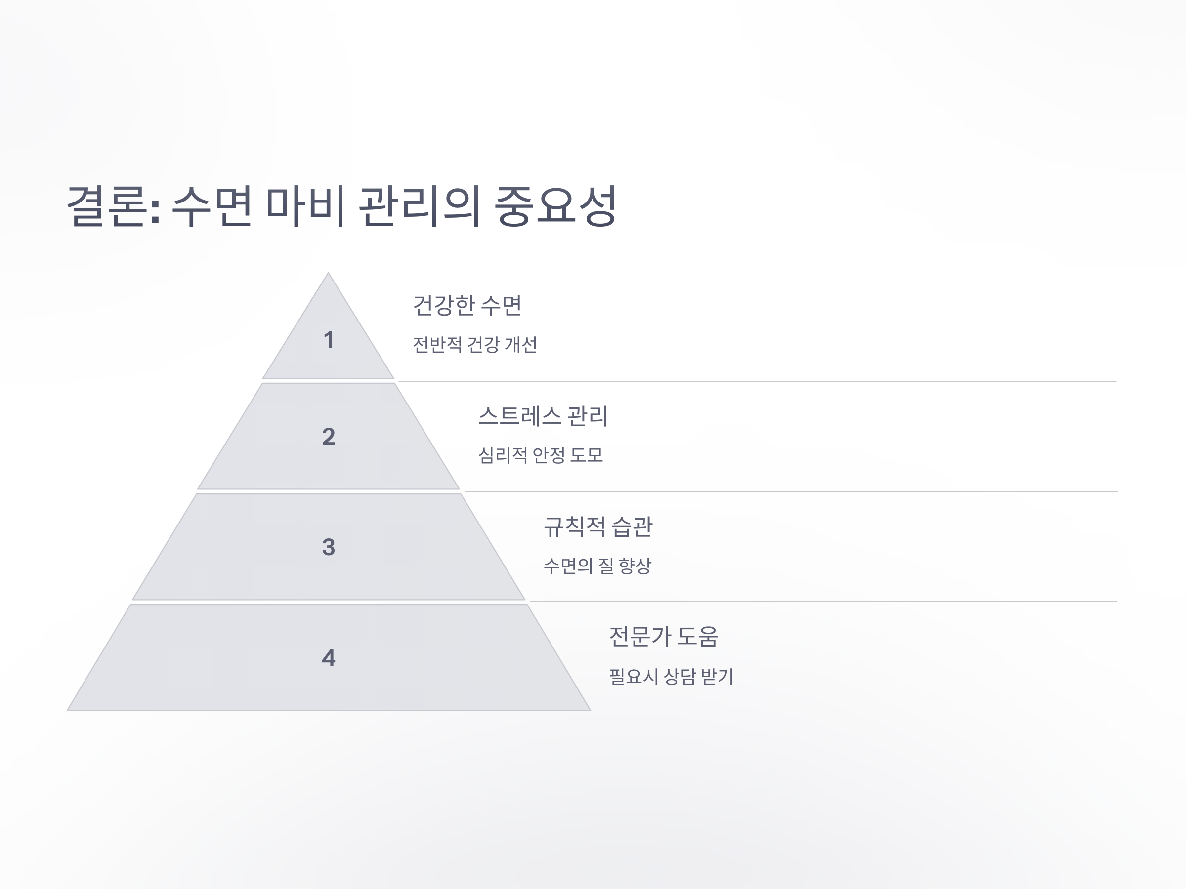 수면 마비는 누구나 한 번쯤 겪을 수 있는 자연스러운 현상일 수 있지만, 그 경험이 불안하고 불쾌할 수 있습니다. 이를 예방하고 관리하기 위해서는 규칙적인 수면 습관을 유지하고, 스트레스를 최소화하는 것이 중요합니다. 또한, 수면 마비가 자주 발생한다면 수면 장애나 정신적인 문제와 관련이 있을 수 있으므로 전문가의 도움을 받는 것이 필요합니다.