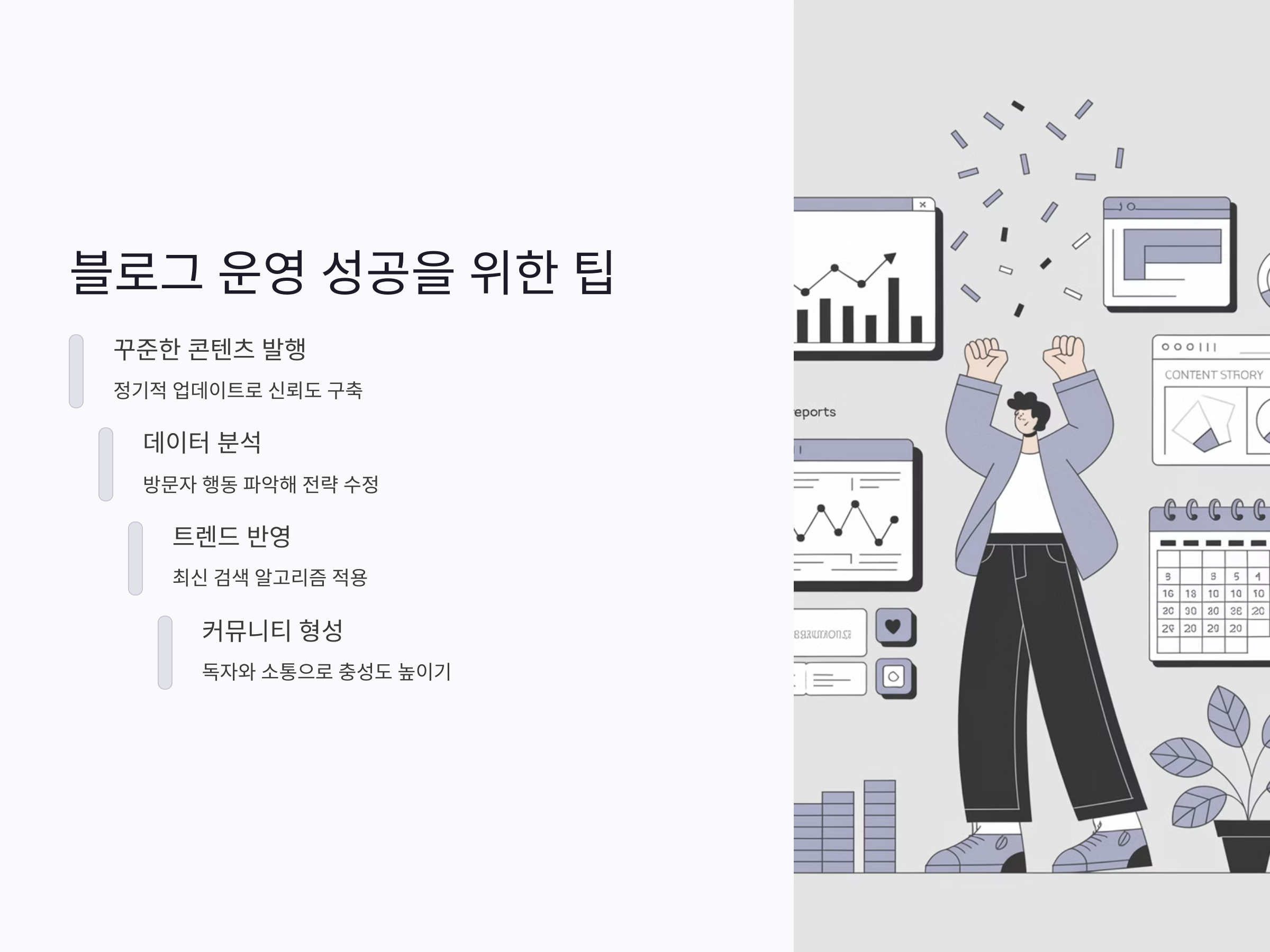 - 꾸준한 업데이트: 일정한 주기로 양질의 콘텐츠를 발행하면 신뢰도를 높일 수 있습니다.