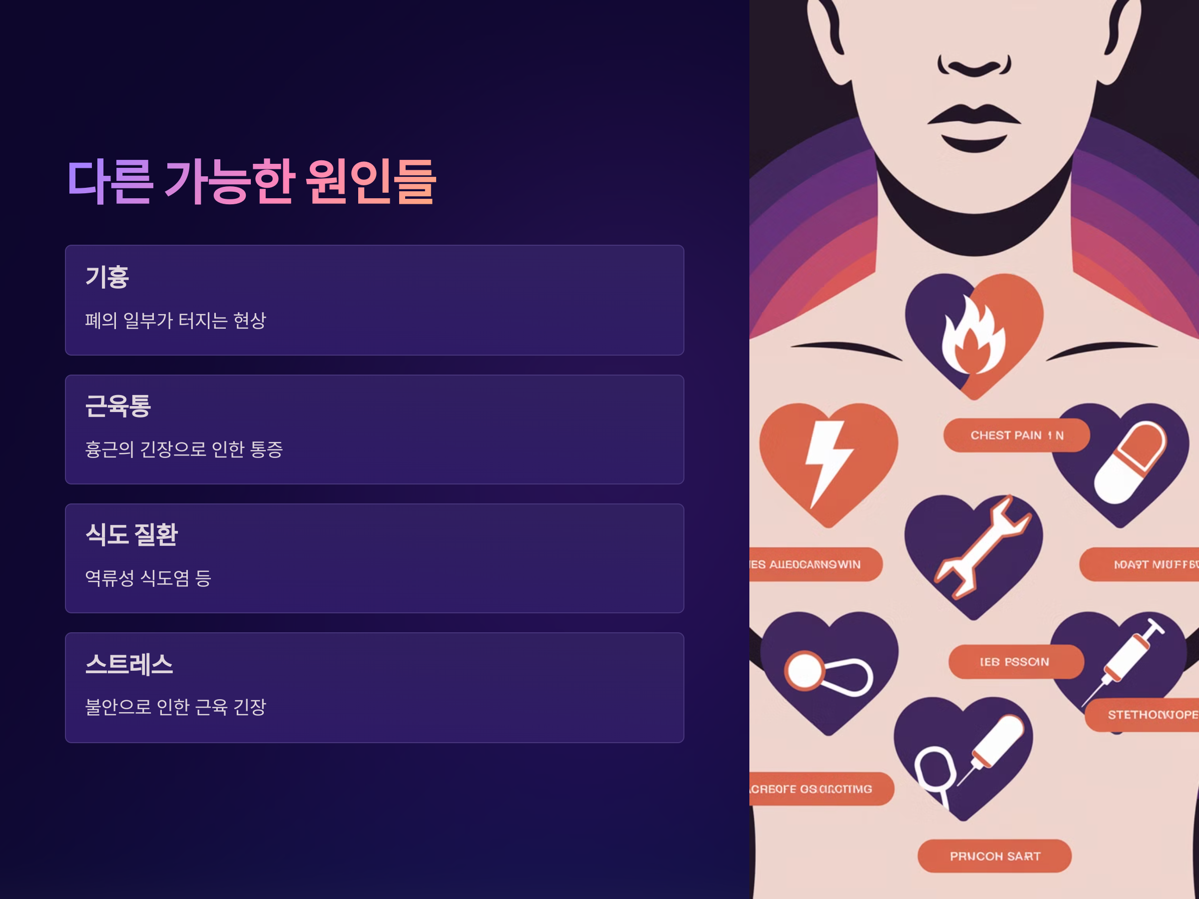 숨을 들이마실 때 가슴에 찌릿한 통증을 유발하는 원인은 늑막염과 심장막염 외에도 여러 가지가 있습니다. 예를 들어, 기흉(폐의 일부가 터지는 것), 근육통(흉근의 긴장), 식도 질환(역류성 식도염 등) 등이 통증을 일으킬 수 있습니다. 또한, 위염이나 위장 질환도 가슴 부위에 불편함을 유발할 수 있습니다.