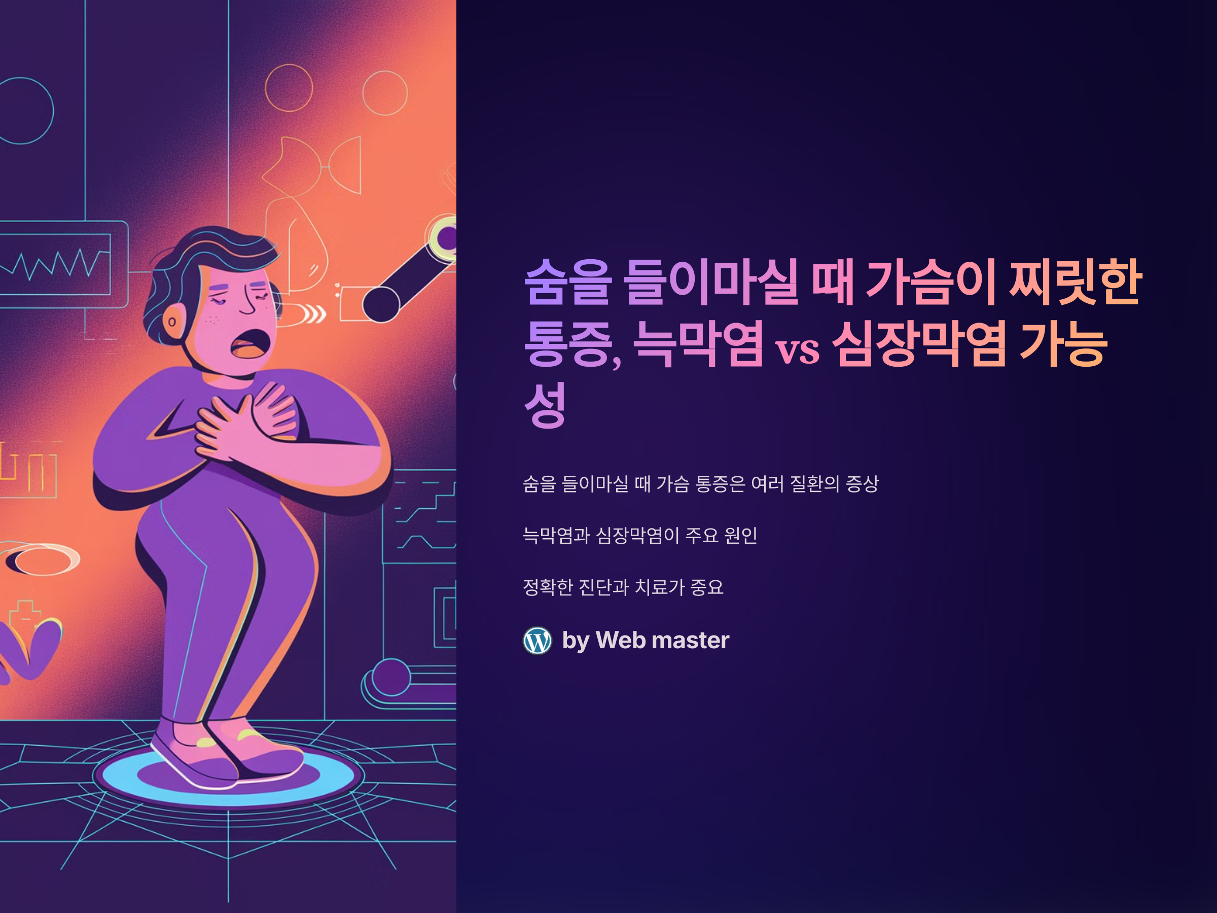 숨을 들이마실 때 가슴에 찌릿한 통증은 매우 불편한 증상이며, 그 원인을 파악하는 것이 중요합니다. 이런 통증은 여러 가지 질환으로 인해 발생할 수 있지만, 특히 늑막염과 심장막염이 의심되는 경우가 많습니다. 두 질환은 각각 폐와 심장을 둘러싼 막에 염증이 생기는 질환으로, 증상상 유사할 수 있기 때문에 차이를 잘 구별해야 합니다. 이 글에서는 늑막염과 심장막염의 증상 및 차이점을 비교하고, 숨을 들이마실 때 가슴 통증을 유발하는 다른 가능성도 함께 살펴보겠습니다.
