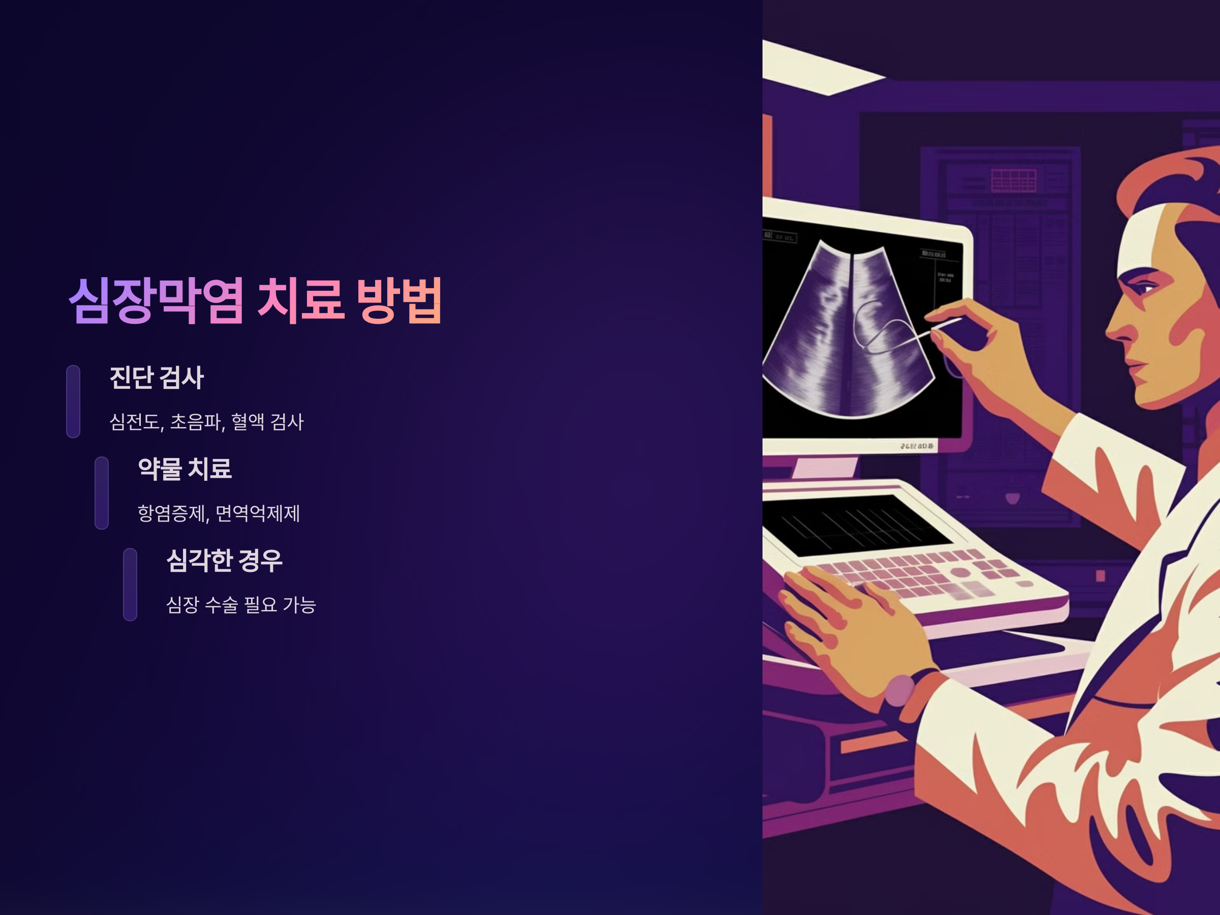 심장막염의 치료는 원인에 따라 다르며, 항염증제나 면역억제제가 사용될 수 있습니다. 심각한 경우에는 심장 수술이 필요할 수 있으므로, 진단 후 적절한 치료를 시작하는 것이 중요합니다.