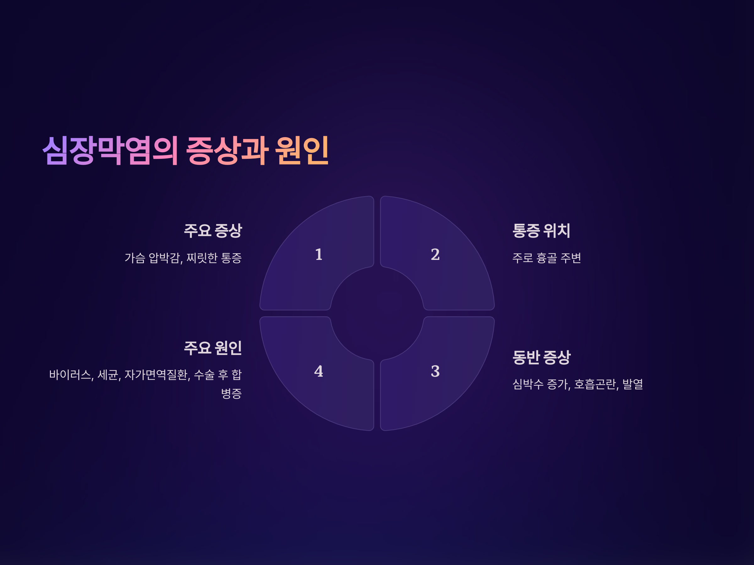 심장막염은 심장을 둘러싼 심장막에 염증이 생기는 질환입니다. 이 염증은 가슴에 압박감이나 찌릿한 통증을 유발할 수 있으며, 숨을 들이마실 때 통증이 증가하는 경우가 많습니다. 심장막염은 바이러스나 세균에 의한 감염 외에도, 자가면역질환이나 심장 수술 후 합병증으로 발생할 수 있습니다.