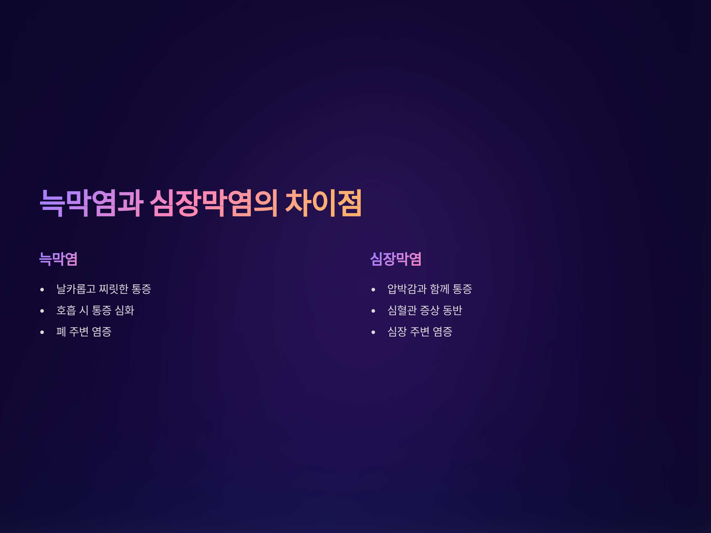 늑막염과 심장막염은 모두 가슴에 통증을 유발하지만, 그 원인과 증상의 차이점이 있습니다. 늑막염은 주로 호흡 시 숨을 들이마실 때 통증이 심해지며, 날카롭고 찌릿한 느낌이 특징입니다. 반면 심장막염은 가슴 압박감과 함께 호흡 시 통증이 더 강하게 느껴지며, 심박수 증가나 호흡 곤란 같은 심혈관 증상이 동반될 수 있습니다.