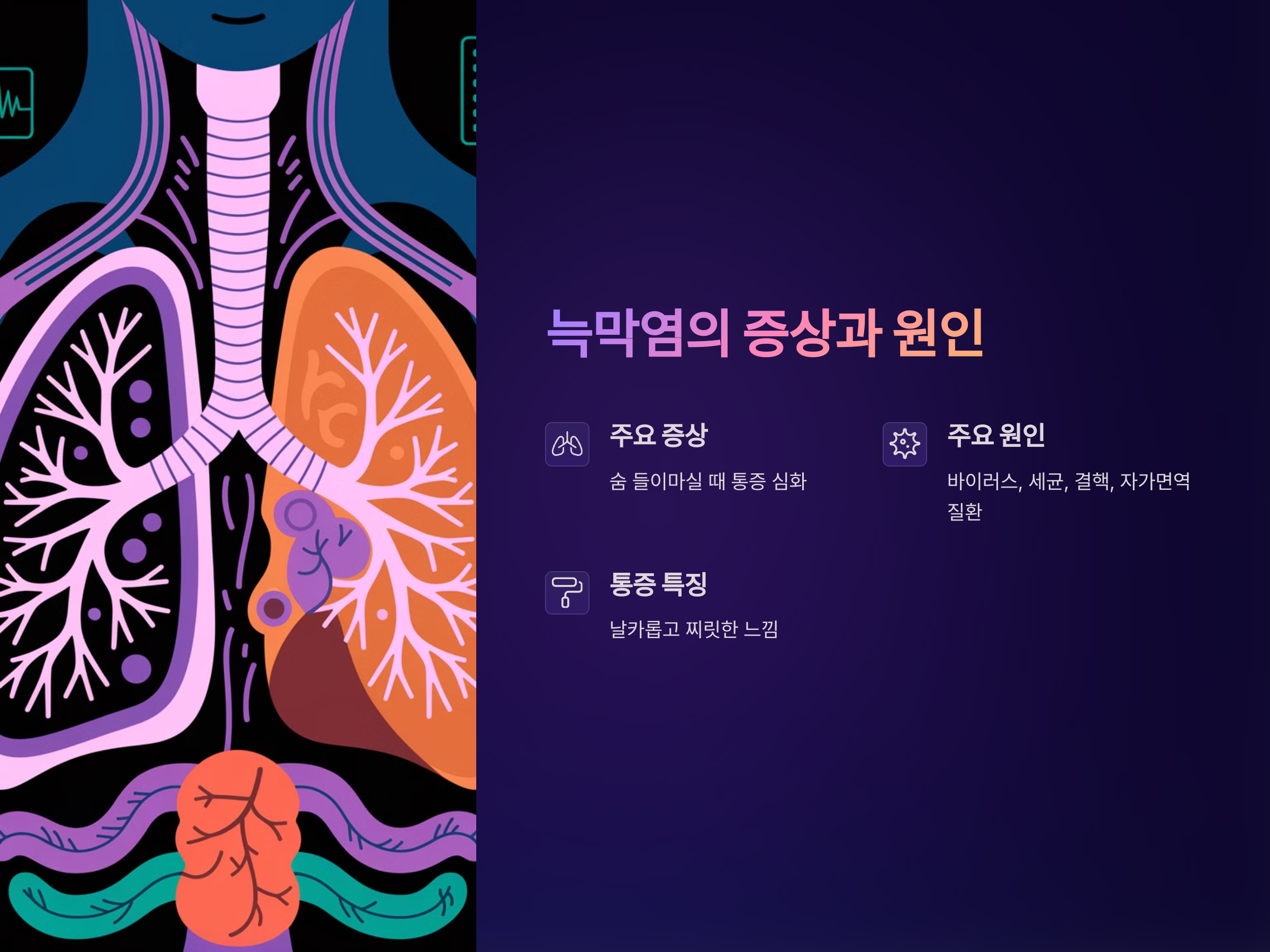 늑막염은 폐를 둘러싼 얇은 막인 늑막에 염증이 생기는 질환입니다. 이 염증으로 인해 흉통, 호흡 시 찌릿한 통증, 기침 등이 나타날 수 있습니다. 특히 숨을 들이마실 때 통증이 더 심해지는 특징이 있습니다. 이는 폐가 확장되면서 염증이 있는 부분에 자극을 주기 때문입니다.