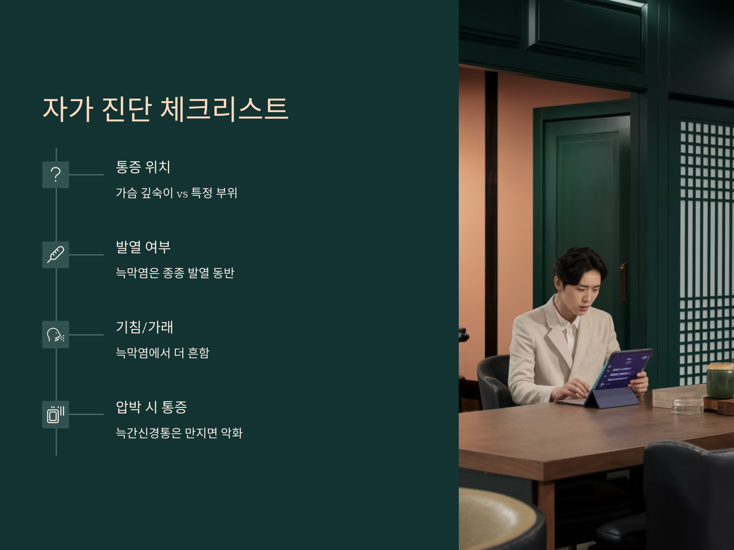 - 호흡 시 통증: 숨을 깊게 들이마시면 통증이 더욱 심해질 수 있습니다.