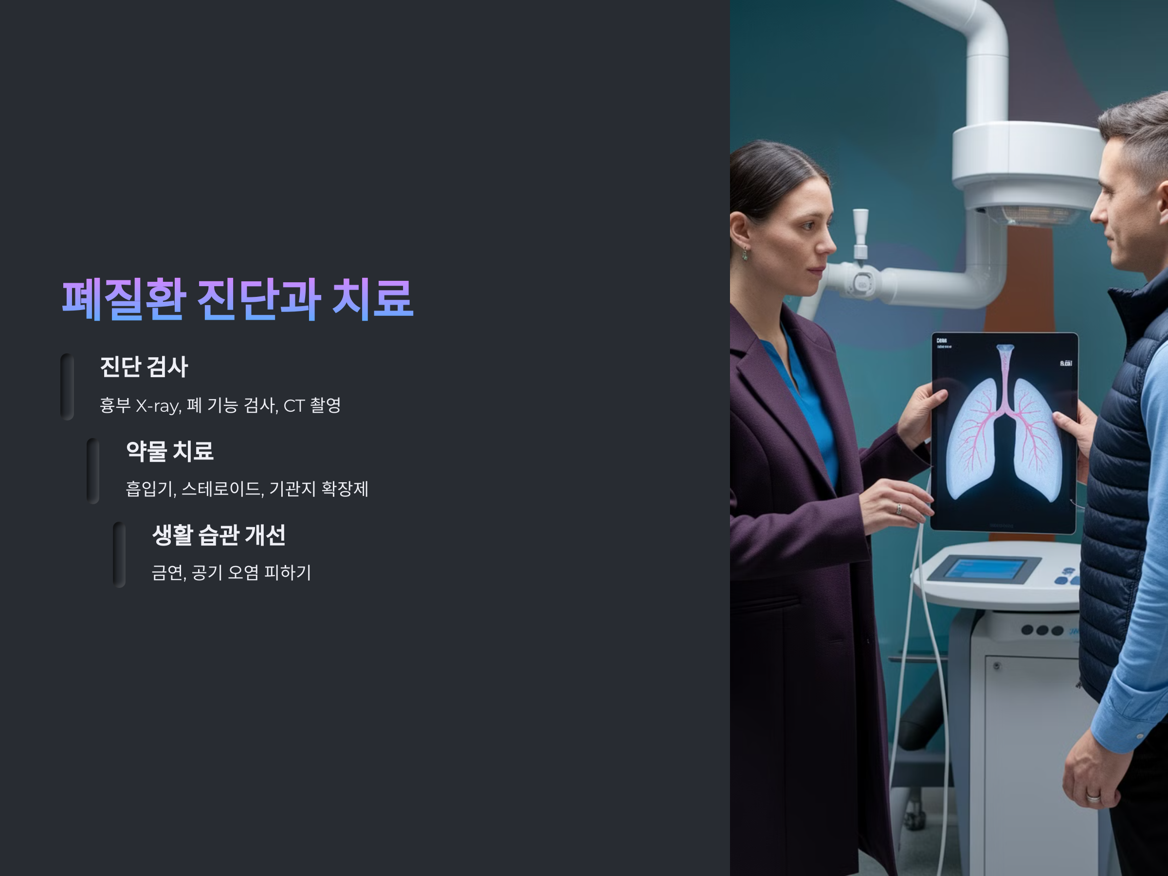 폐질환의 치료는 증상의 정도에 따라 달라지며, 주로 약물 치료와 함께 폐를 보호하는 방법을 모색합니다. 흡입기나 스테로이드 약물이 사용되며, 폐 기능을 개선하고 호흡 곤란을 완화시키는 데 도움이 됩니다. 또한, 폐 질환의 예방을 위해서는 금연이 가장 중요한 예방법입니다.