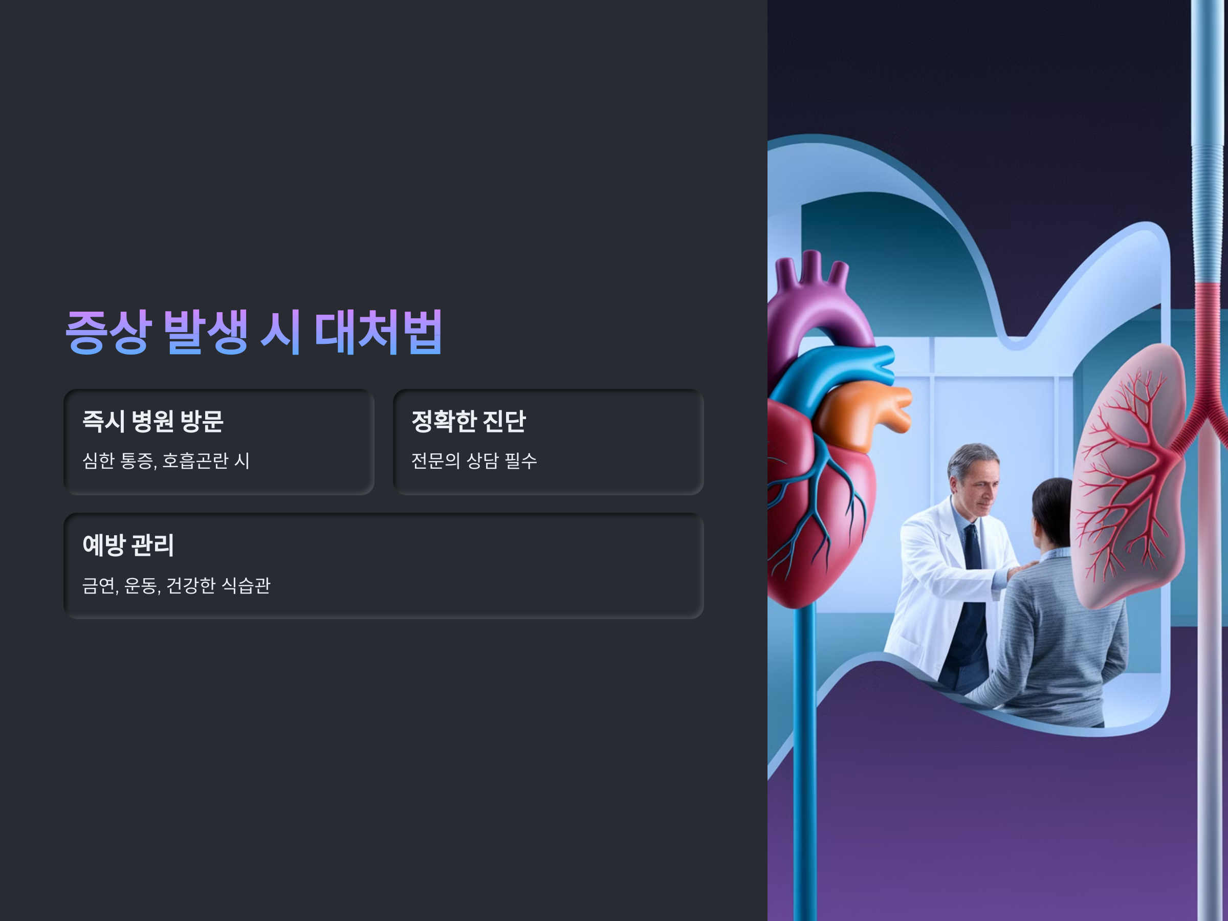 숨을 쉴 때 가슴이 답답하고 조이는 느낌은 협심증과 폐질환 모두에서 나타날 수 있는 증상입니다. 그러나 그 원인과 증상의 진행 양상은 다르기 때문에, 증상이 발생하면 빠르게 진단을 받고 적절한 치료를 받는 것이 중요합니다. 협심증은 주로 심장과 관련된 문제로, 폐질환은 호흡기와 관련된 문제로 발생하며, 각각의 질환에 맞는 치료가 필요합니다. 증상이 심해지기 전에 병원을 찾아 전문가의 상담을 받는 것이 건강을 지키는 가장 좋은 방법입니다.
