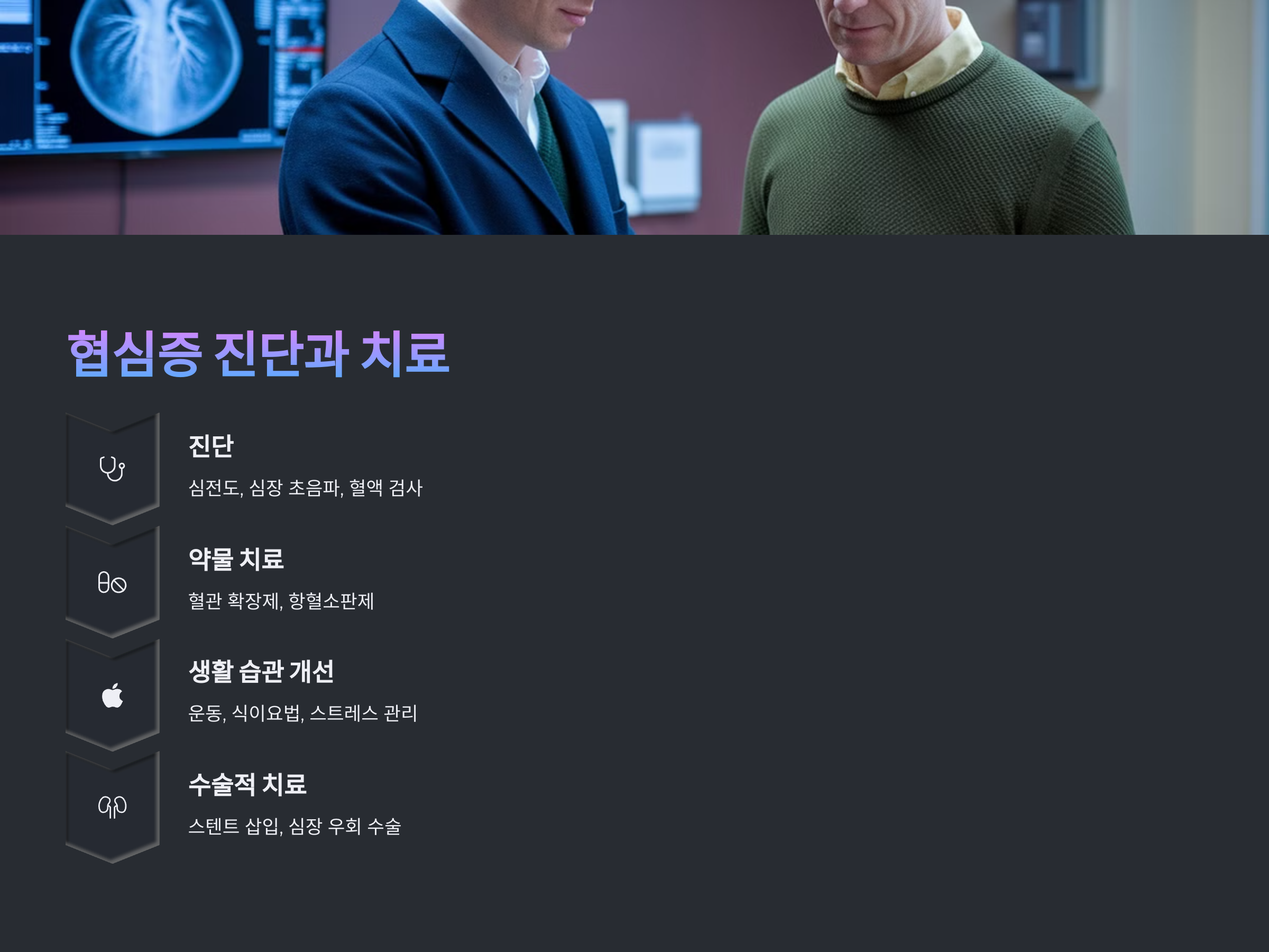 협심증의 치료는 주로 약물 치료와 생활습관 개선을 통해 이루어집니다. 약물 치료로는 심장 혈관을 확장시켜 혈류를 원활하게 만드는 약물이 사용될 수 있습니다. 또한, 스트레스를 줄이고 규칙적인 운동을 하며, 식이요법을 통해 심장에 부담을 덜어주는 것이 중요합니다. 경우에 따라 스텐트 삽입이나 심장 우회 수술이 필요할 수도 있습니다.