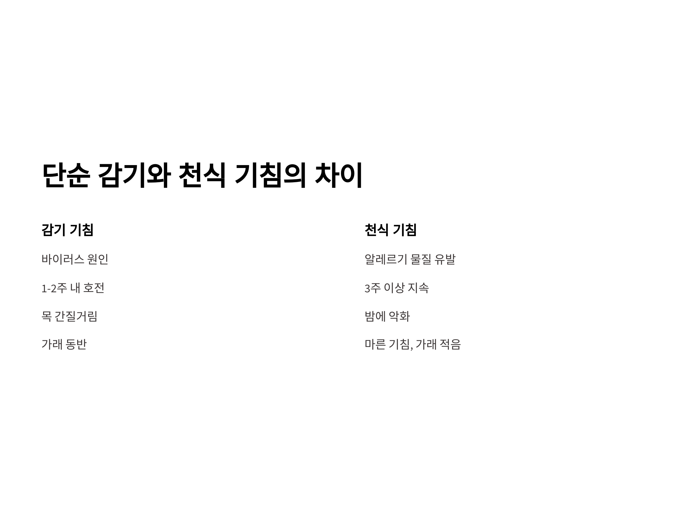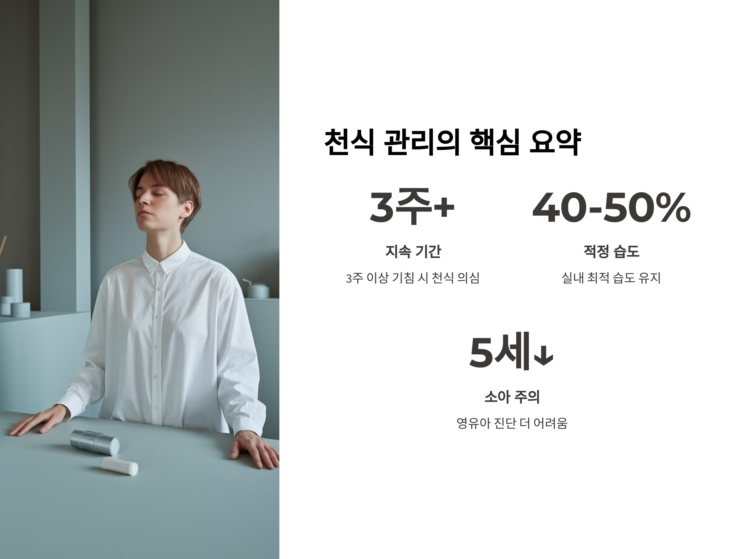 에어컨이나 난방으로 실내 공기가 건조해질 경우 가습기를 사용하는 것도 좋은 방법이며, 외출 시에는 목도리로 목을 보호해 외부 자극을 줄이는 것도 중요합니다. 충분한 수면을 통해 면역력을 유지하는 것도 빠른 회복에 도움이 됩니다.