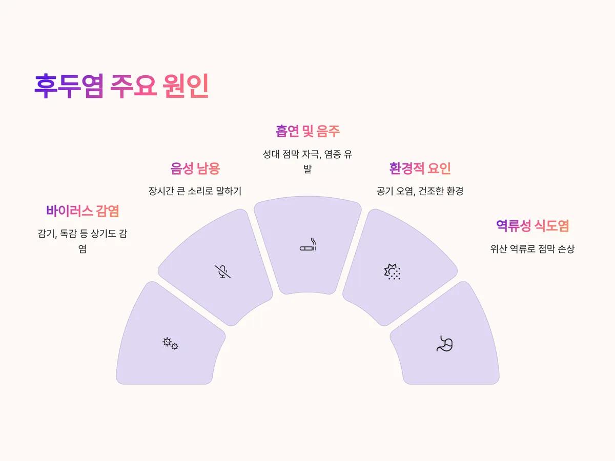 이러한 원인들은 단독으로 또는 복합적으로 작용하며, 반복적인 자극은 후두 점막을 약화시켜 만성 후두염으로 이어질 수 있습니다.