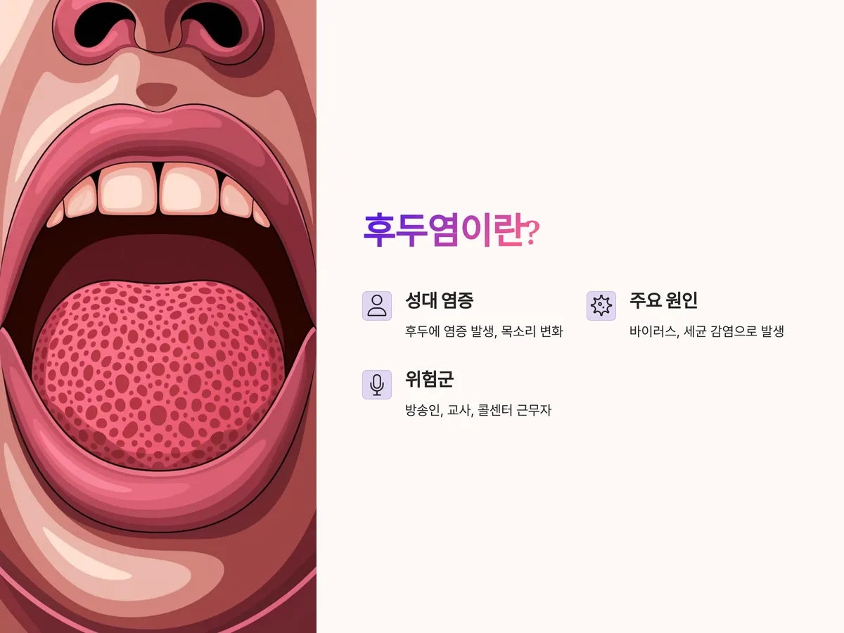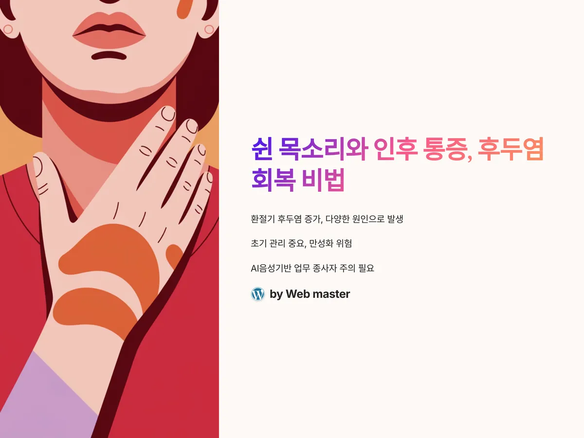 목이 아프고 목소리가 쉬어버렸다면 단순 감기일까요, 아니면 후두염의 시작일까요? 요즘처럼 환절기에는 감기와 함께 후두염이 유행하면서 인후 통증과 쉰 목소리를 호소하는 이들이 많아졌습니다. 최근 의료계에 따르면 후두염은 바이러스나 세균 감염 외에도 음성 남용, 알레르기, 역류성 식도염 등 다양한 원인으로 발생할 수 있으며, 증상이 심화되면 만성 후두염으로 이어질 수 있다는 점에서 초기 관리가 무엇보다 중요하다고 경고합니다. 특히 AI음성기반 업무가 늘어나며 음성을 자주 사용하는 직군에서는 더 많은 주의가 필요해졌습니다. 이번 포스팅에서는 후두염의 주요 증상부터 빠르게 회복하는 방법, 피해야 할 행동과 음식까지 전부 알려드립니다. 목소리를 지키고 인후통을 덜어내는 더 좋은 방법, 지금 바로 확인해보세요.