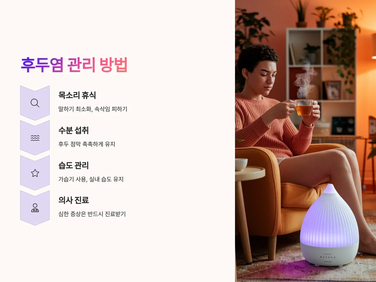 - 가습기 사용: 실내 습도 유지로 인후 건조 방지