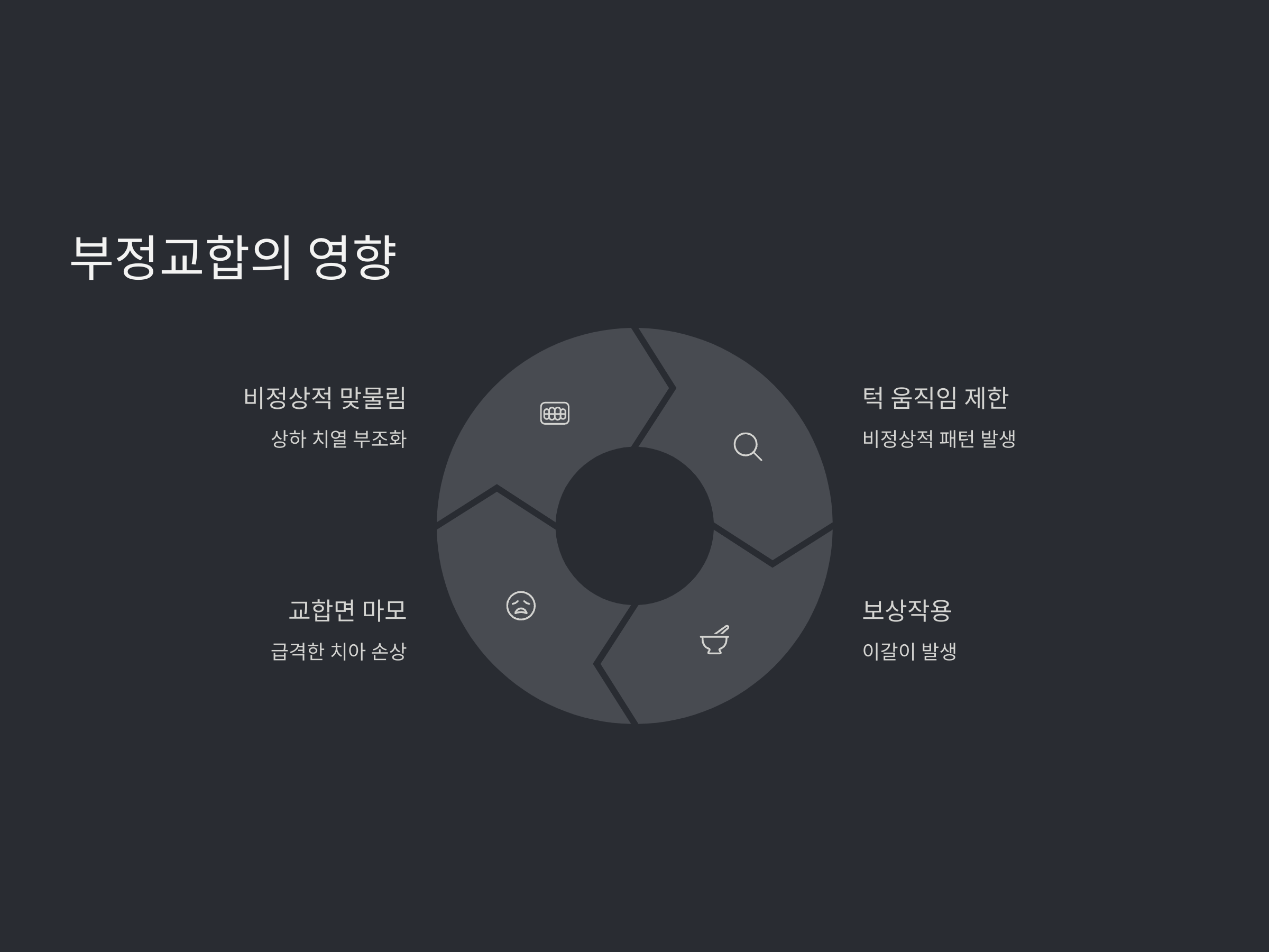 치아의 맞물림이 정상적이지 않은 '부정교합'은 턱 근육과 관절에 불균형한 힘을 가하게 되어 이갈이를 유발하거나 악화시킬 수 있습니다. 상하 치열이 정확히 맞지 않을 경우, 턱의 움직임이 제한되거나 비정상적인 패턴으로 바뀌며 그 보상작용으로 이갈이가 나타납니다. 특히 측방운동이 과도하게 이뤄질 경우 교합면 마모가 급격하게 진행됩니다.