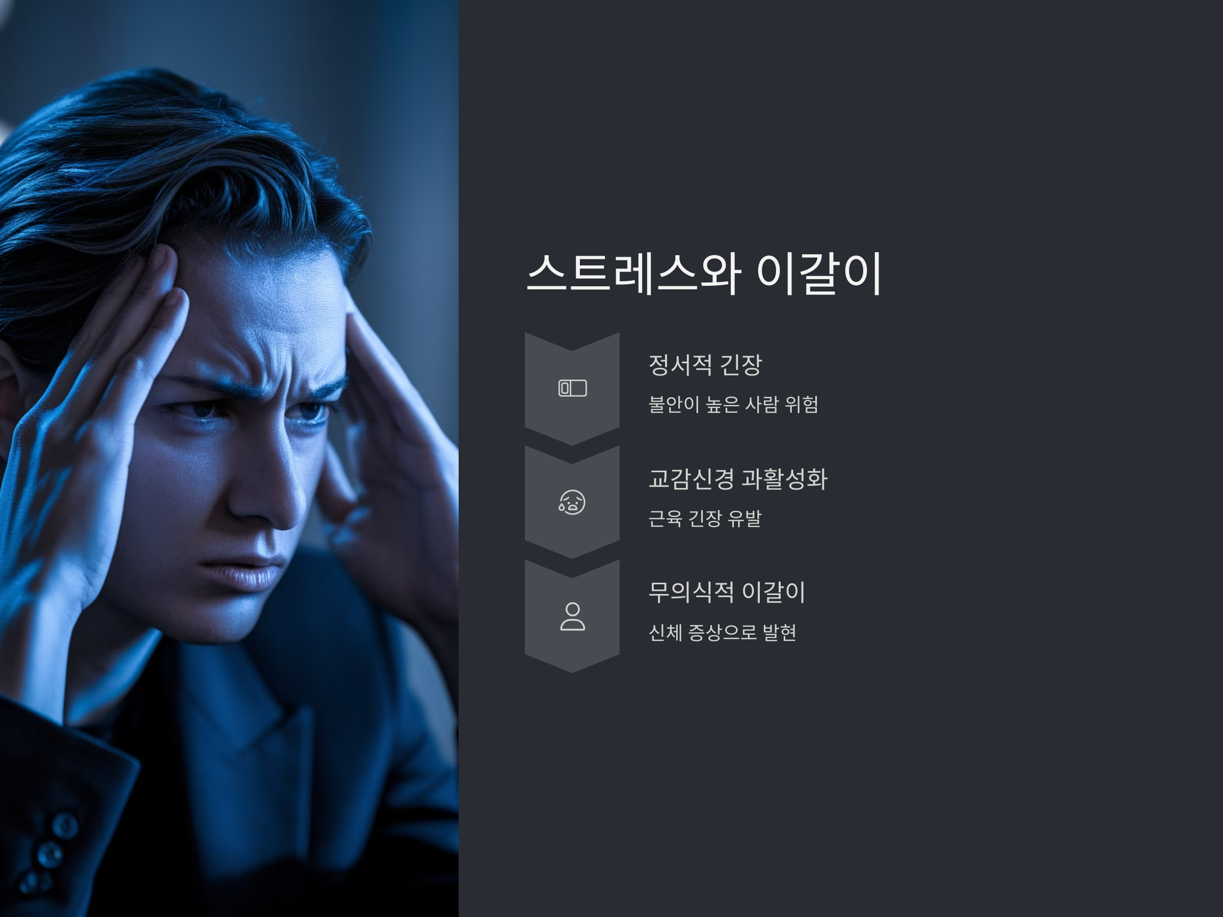 스트레스는 이갈이의 가장 큰 원인 중 하나로 꼽힙니다. 특히 정서적인 긴장과 불안이 높은 사람일수록 수면 중 교감신경이 과활성화되어 근육 긴장을 유발하게 되며, 이로 인해 무의식적인 이갈이 행동이 나타납니다. 이는 단순히 하루의 스트레스 때문이 아니라, 장기적으로 누적된 정신적 부담이 신체 증상으로 발현되는 대표적인 예라 할 수 있습니다.