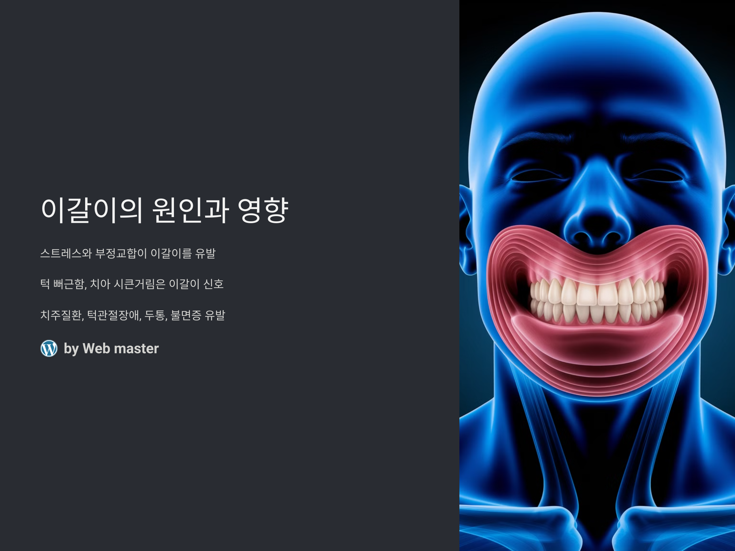 자고 일어나면 턱이 뻐근하고, 이유 없이 치아가 시큰거리는 경험을 한 적 있으신가요? 이는 단순한 피로나 무의식적인 습관이 아닌 '이갈이'일 수 있습니다. 특히 현대인의 고질적인 스트레스와 턱 관절의 비정상적인 구조인 부정교합은 이갈이의 대표적인 원인으로 꼽히고 있습니다. 최근에는 이갈이가 치주질환, 턱관절장애, 심지어 두통이나 불면증까지 유발하는 복합적인 문제로 떠오르고 있어 조기 진단과 치료의 중요성이 더욱 커지고 있습니다.