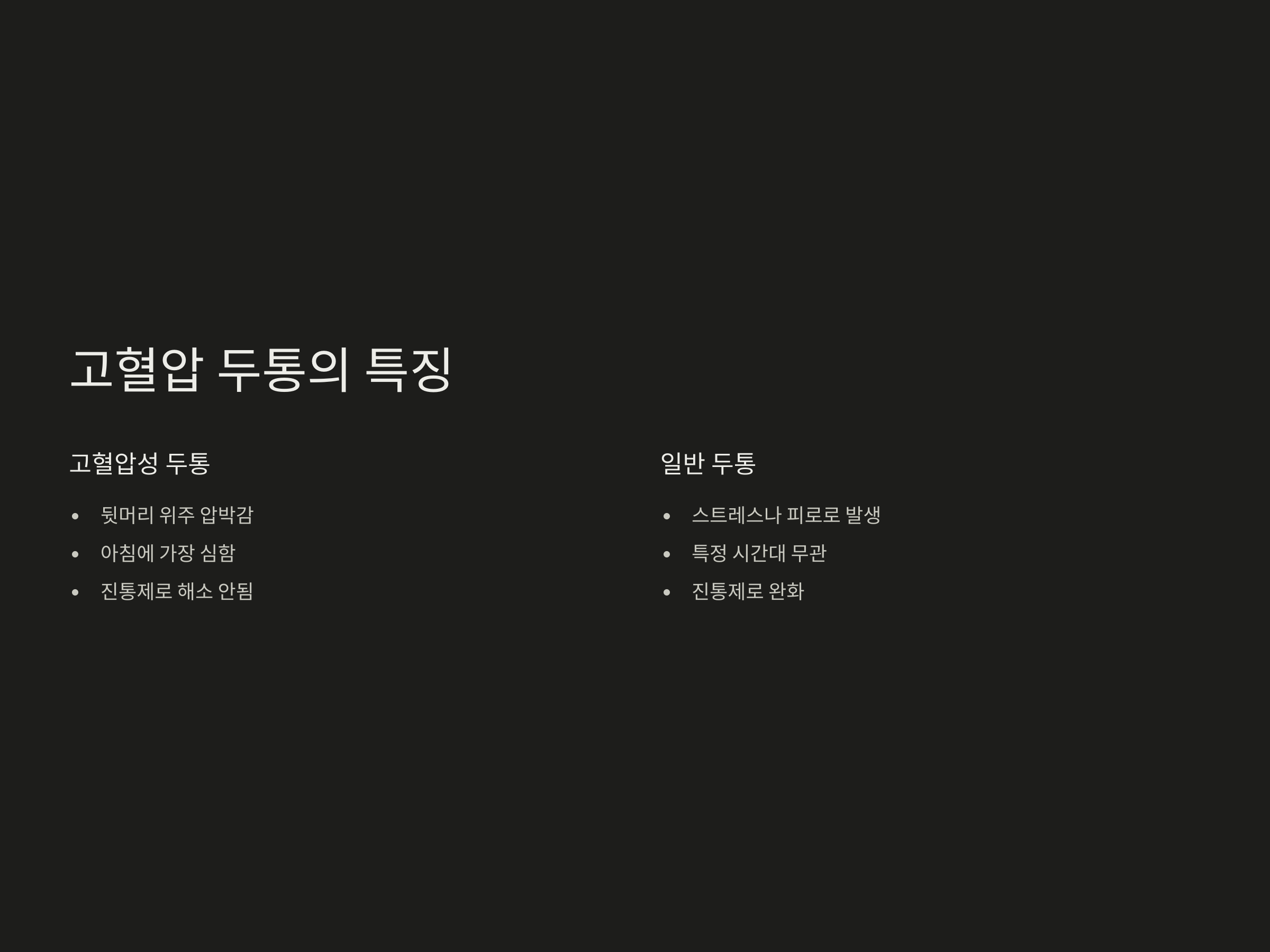 일반적인 긴장성 두통이나 편두통과 달리 고혈압성 두통은 압박감이 매우 강하고 뒷머리 위주로 발생하는 경향이 있습니다. 또한 아침에 기상 직후에 가장 심한 경우가 많으며, 일상 활동을 시작하면서 점차 완화되는 것이 특징입니다. 반면, 일반 두통은 스트레스나 피로 누적에 따라 발생하며 특정 시간대와 관계없이 생기는 경우가 많습니다.