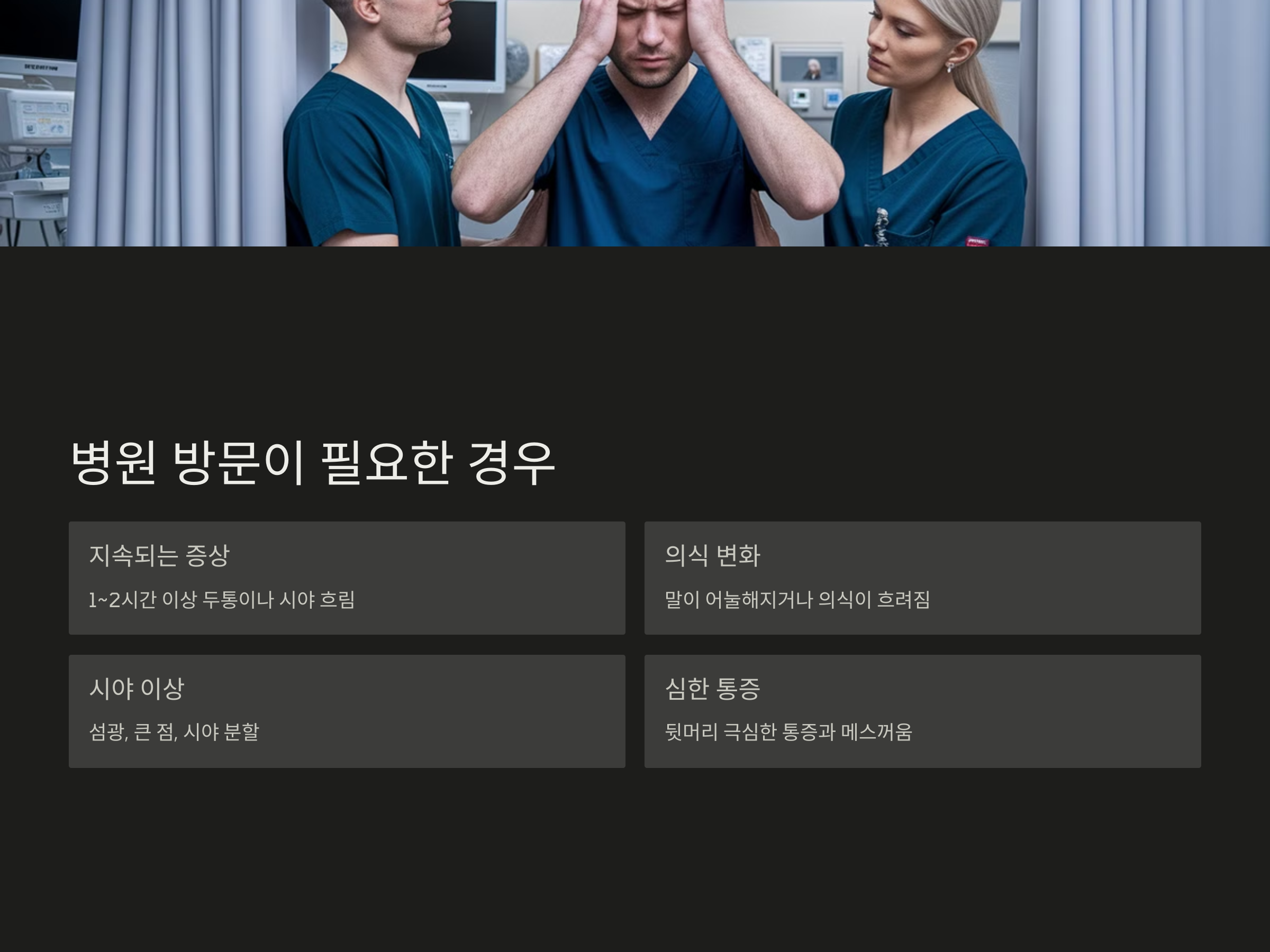 시야 흐림이나 두통이 1~2시간 이상 지속되거나, 진통제를 복용해도 효과가 없다면 지체하지 말고 병원을 방문해야 합니다. 특히 다음과 같은 경우에는 응급 상황일 수 있으니 즉시 119에 연락하거나 가까운 응급실로 이동해야 합니다.