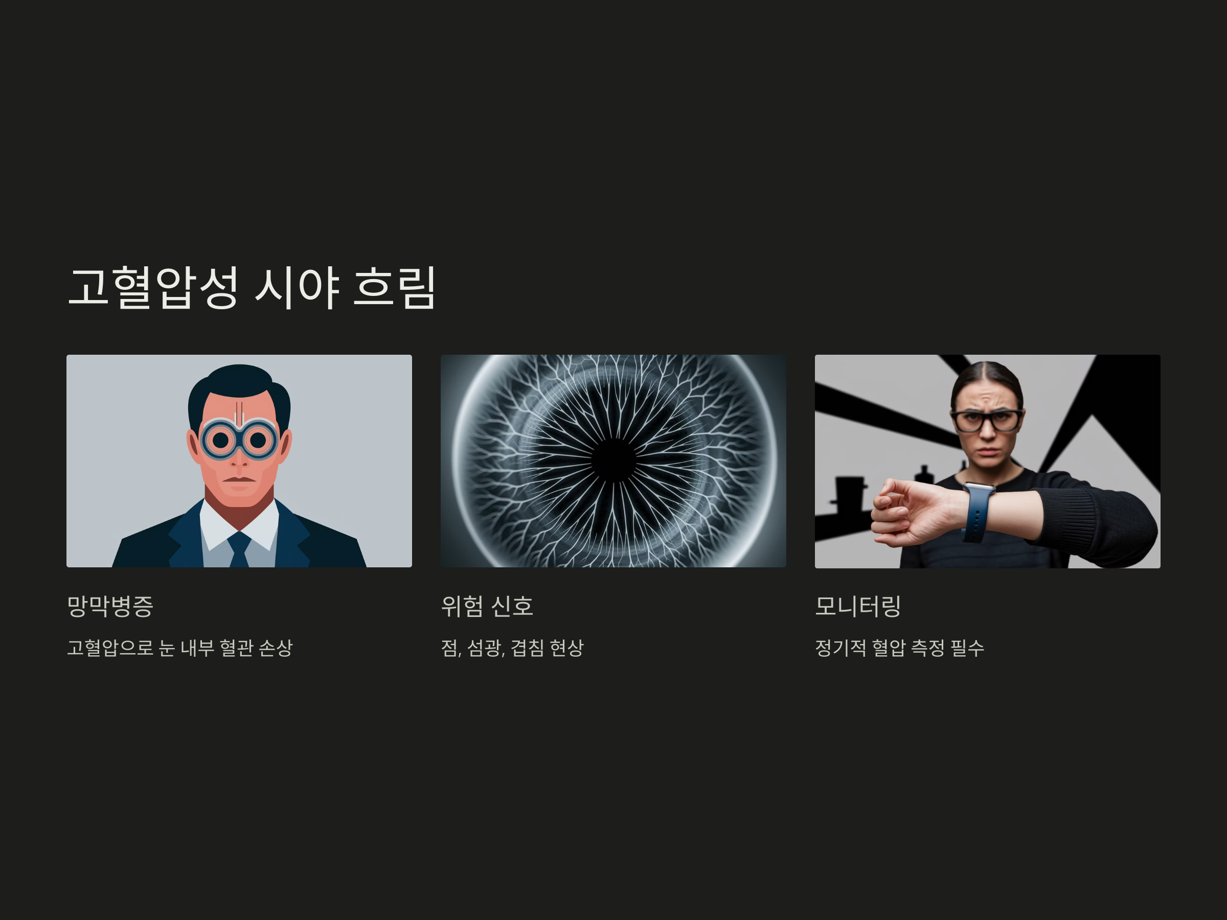 시야가 뿌옇게 흐려지는 증상은 단순히 피곤해서 생기는 것이 아니라 고혈압이 눈의 망막 혈관에 영향을 미친 결과일 수 있습니다. 고혈압성 망막병증은 고혈압이 장기간 지속되면서 눈 안의 미세 혈관이 손상되고 출혈이 발생해 시력이 떨어지는 증상입니다. 시야에 점, 섬광, 흐림, 겹침 현상이 자주 발생한다면 안과와 내과를 함께 진료받는 것이 좋습니다.