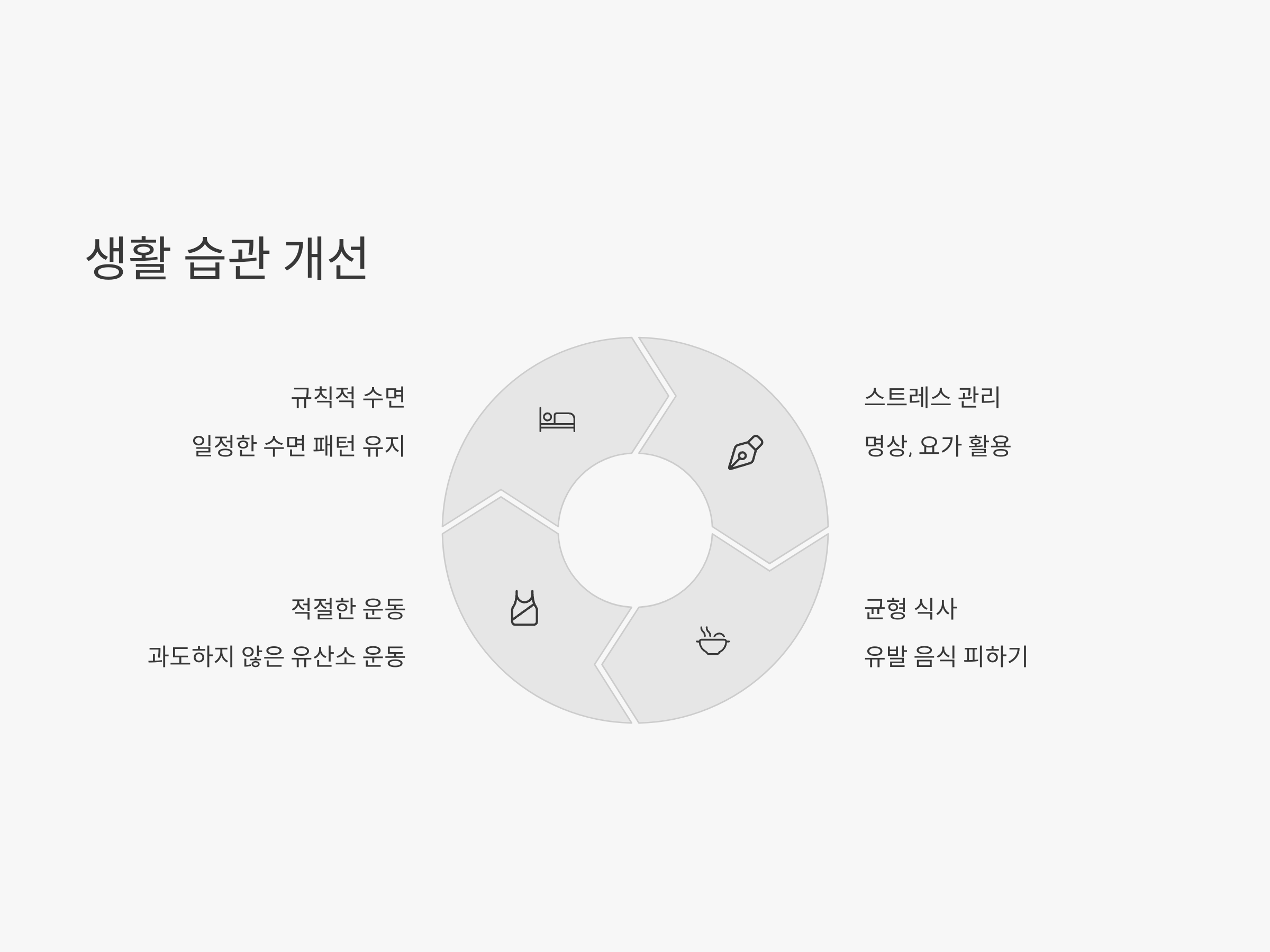 - 스트레스 관리: 명상, 요가 등으로 스트레스를 효과적으로 관리합니다.