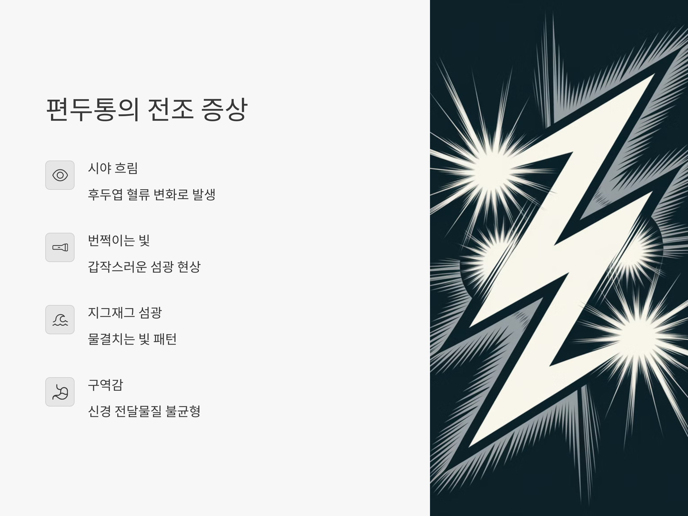 편두통의 전조 증상은 두통이 시작되기 전에 나타나는 신호로, 개인마다 다양하게 나타납니다. 그중 시야 흐림과 구역감은 흔한 증상으로 알려져 있습니다.