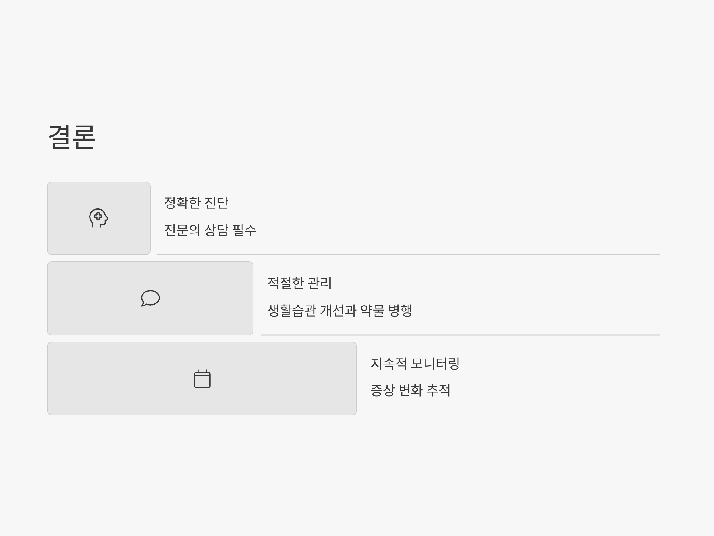 - 영상 검사: 필요 시 뇌 MRI나 CT 촬영을 통해 다른 신경학적 질환을 배제합니다.