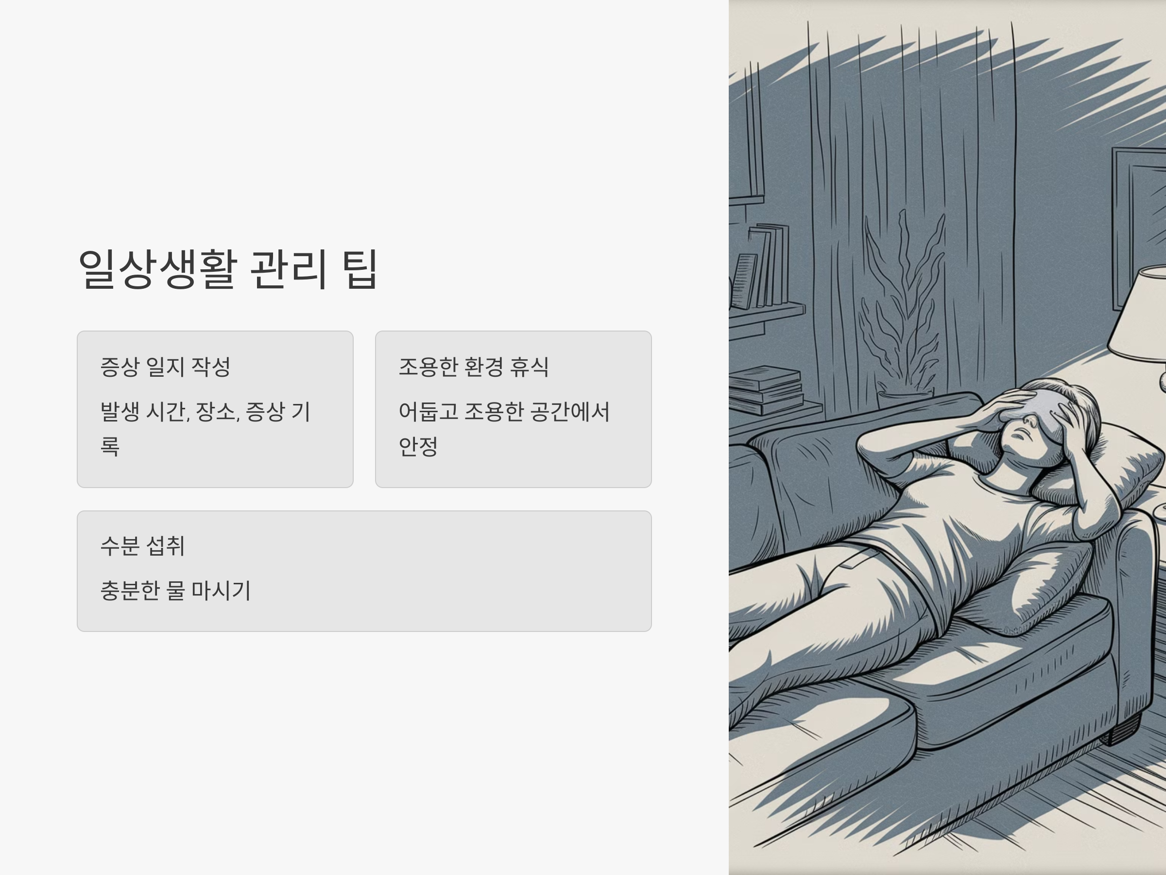 일상생활에서 편두통의 전조 증상을 관리하기 위한 몇 가지 팁을 소개합니다: