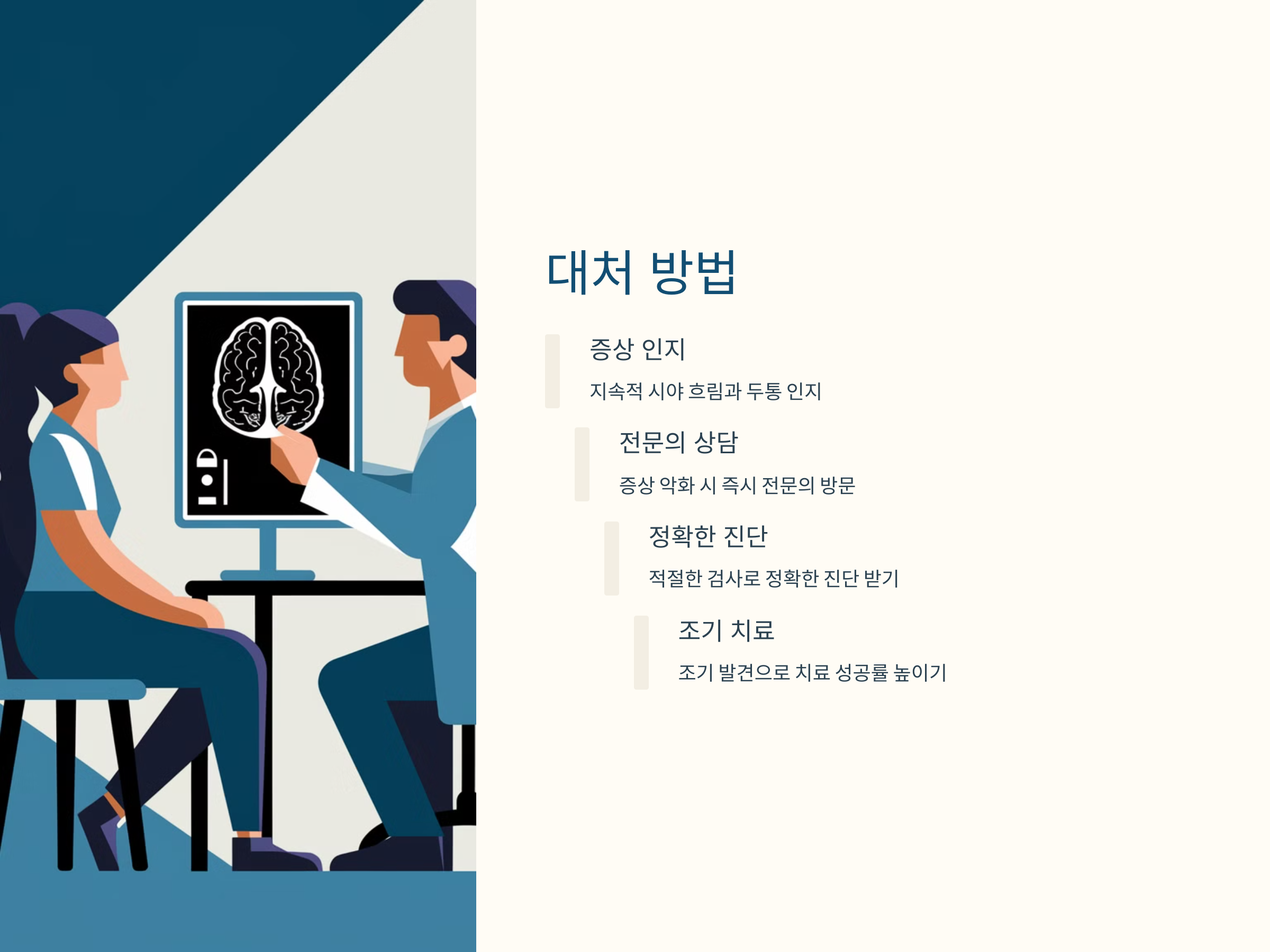 시야 흐림과 만성 두통이 지속되거나 점점 심해지는 경우, 이를 단순한 증상으로 간과하지 말고 전문의와 상담하는 것이 중요합니다. 조기 발견을 통해 치료의 성공률을 높일 수 있으며, 증상의 악화를 방지할 수 있습니다. 또한, 정기적인 건강 검진을 통해 뇌 건강을 체크하는 것도 예방에 도움이 됩니다.